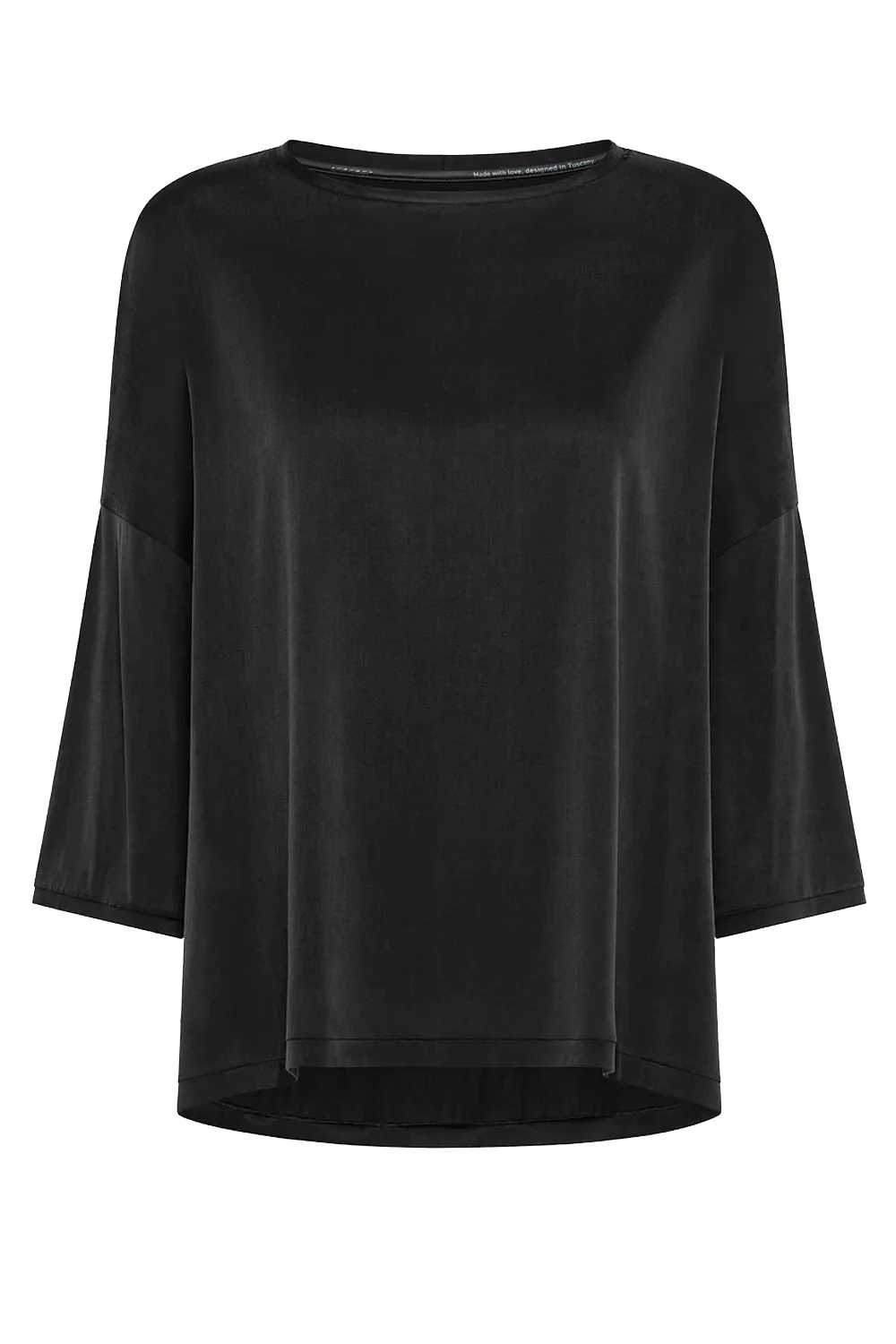 RRD La maglia in Cupro colore nero reinterpreta il minimalismo contemporaneo con un taglio boxy fluido, spalle volutamente scese e maniche a tre quarti che accarezzano la silhouette. Il morbido girocollo ne esalta l’allure minimal-chic, mentre la luce preziosa del tessuto fresco, leggero e dalla piacevole mano setosa, la rende ideale per la donna che vive la modernità con stile e praticità. Perfetta per costruire un look soft chic, questa creazione dalla vestibilità loose trova la sua massima espressione in abbinamento ai pantaloni coordinati Cupro Travel Wom Pant, per un ensemble dinamico e sofisticato nelle occasioni speciali e in viaggio