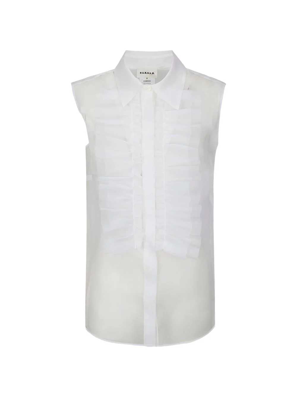 La camicia bianca da donna Parosh reinterpreta la classica camicia senza maniche con un design essenziale e ricercato. Il modello presenta colletto a punta e pannello frontale decorato da applicazioni plissettate tono su tono, per un effetto elegante e discreto.La linea dritta valorizza con naturalezza diverse silhouette, rendendo questa camicia adatta sia a look formali sia a outfit più casual. Scopri tutti i dettagli di Parosh Camicia Bianco Donna su Di Pierro Brand Store.