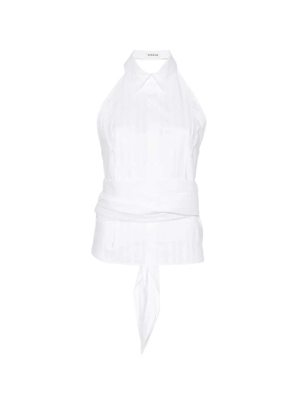 Modello: camicia bianca da donna senza maniche con collo a camicia Materiali: tessuto leggero a mano liscia (composizione non specificata) Colore: bianco Design/Stile: linea aderente con pannello che avvolge il punto vita e annodo frontale Logo: etichetta interna con logo brand Vestibilità: sagomata sul busto, ideale per abbinamenti sia casual sia eleganti Chiusura/Tasche/Suola: chiusura tramite annodo in vita; assenza di tasche visibili Dettagli: costruzione halter con spalle scoperte e bordi puliti Codice Prodotto: D381302CANYOX26_001Nessuna informazione disponibile