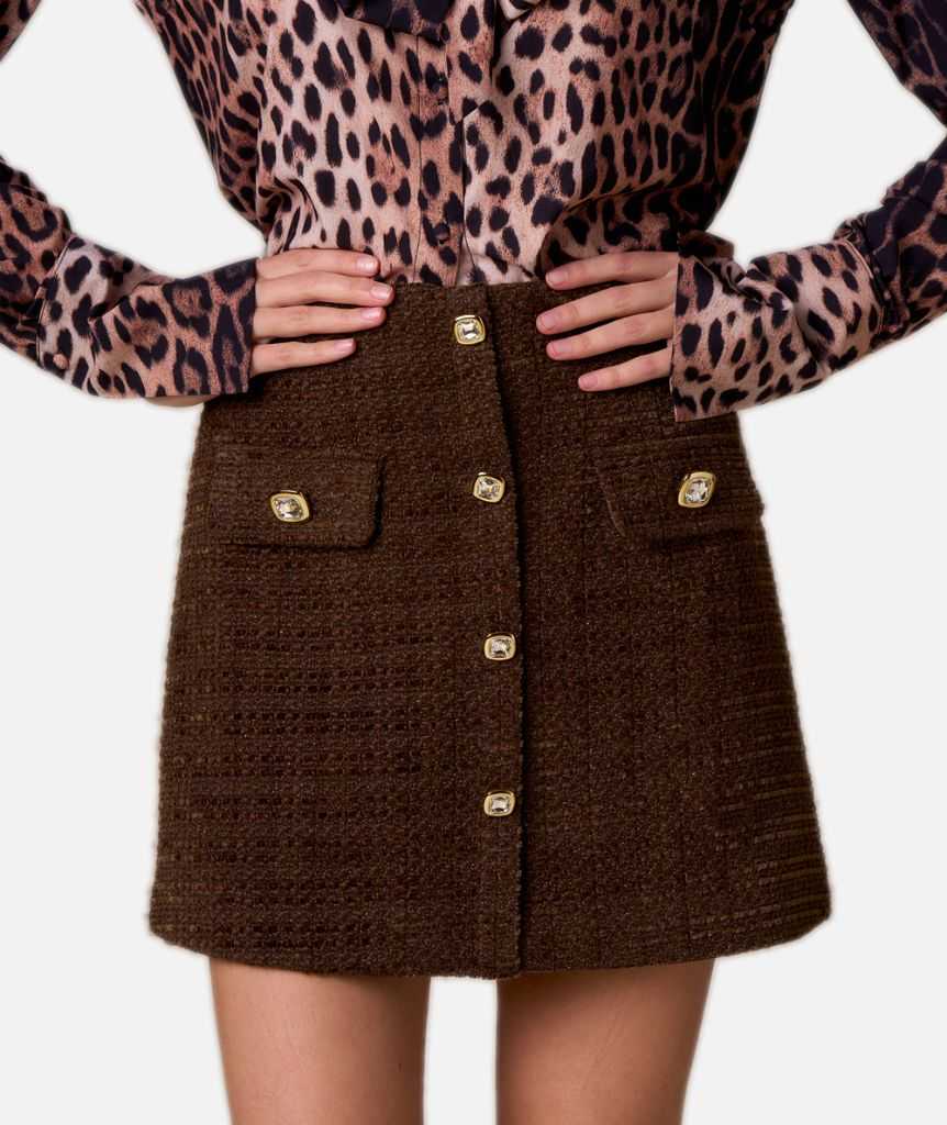 Minigonna in bouclette dal taglio dritto con bottoni dorati. Un capo dallo stile bon ton, perfetto per look eleganti e decisi.