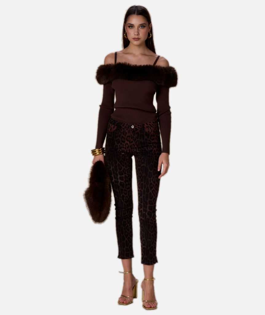 Maglia lavorata a coste strette, con scollatura a barca e spalline sottili. Scollo arricchito con inserto in ecopelliccia.
