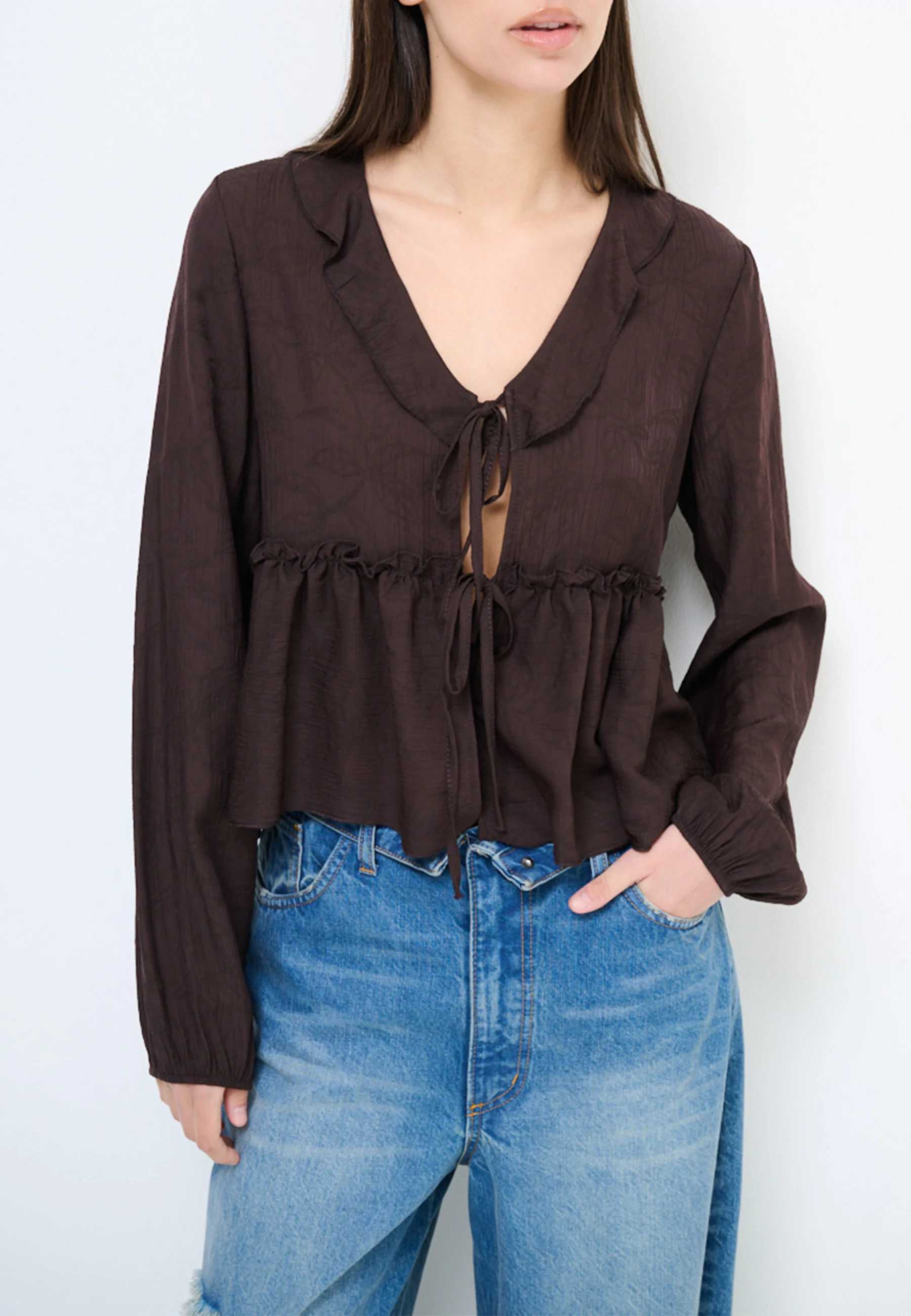 Blusa donna KIKISIX dal gusto femminile e contemporaneo, perfetta per completare look casual ricercati e abbinamenti più raffinati. Dalla foto si distingue per la linea morbida e fluida, con scollo a V rifinito da laccetti frontali che donano movimento e un dettaglio delicato al capo. La balza sotto il seno crea un effetto leggermente svasato che valorizza la vestibilità, mentre le maniche lunghe con polsino morbido aggiungono equilibrio e leggerezza all’insieme. Il tessuto appare fresco e arioso, ideale per la stagione estiva o per la mezza stagione, con una texture lievemente mossa che rende la blusa ancora più attuale. Il design corto e versatile la rende perfetta con jeans, pantaloni a vita alta o gonne, per outfit donna dallo stile disinvolto ma curato. Una proposta KIKISIX Made in Italy pensata per chi cerca un capo femminile, leggero e facile da interpretare in chiave moderna.