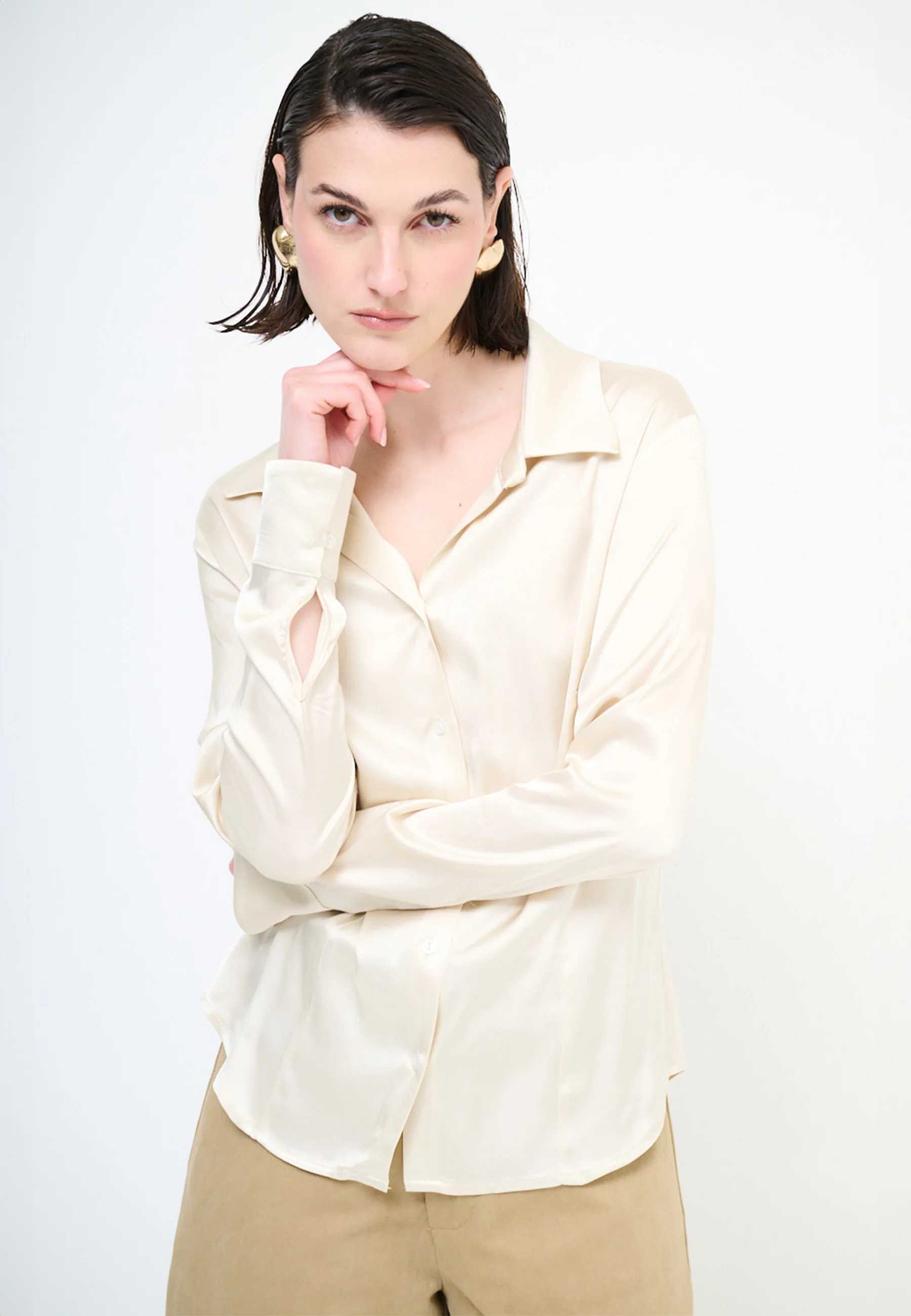 Camicia donna KIKISIX dal gusto essenziale e raffinato, ideale per chi cerca un capo versatile da indossare in contesti casual chic o più eleganti. Dall’immagine emerge una linea morbida ma femminile, valorizzata dalla struttura sfiancata che accompagna la silhouette con naturalezza. Il tessuto effetto raso dona luminosità al capo e rende il look più ricercato, mentre l’abbottonatura centrale e lo scollo aperto con ispirazione a V aggiungono un tocco sobrio e contemporaneo. I polsini alti completano il design con un dettaglio distintivo, capace di dare carattere anche agli abbinamenti più semplici. Perfetta con pantaloni sartoriali, denim o gonne dalla linea pulita, questa camicia si presta a diverse occasioni d’uso, dal lavoro al tempo libero. In pieno stile KIKISIX, unisce femminilità, praticità e gusto moderno, diventando un alleato di stagione per un guardaroba aggiornato e facile da interpretare.