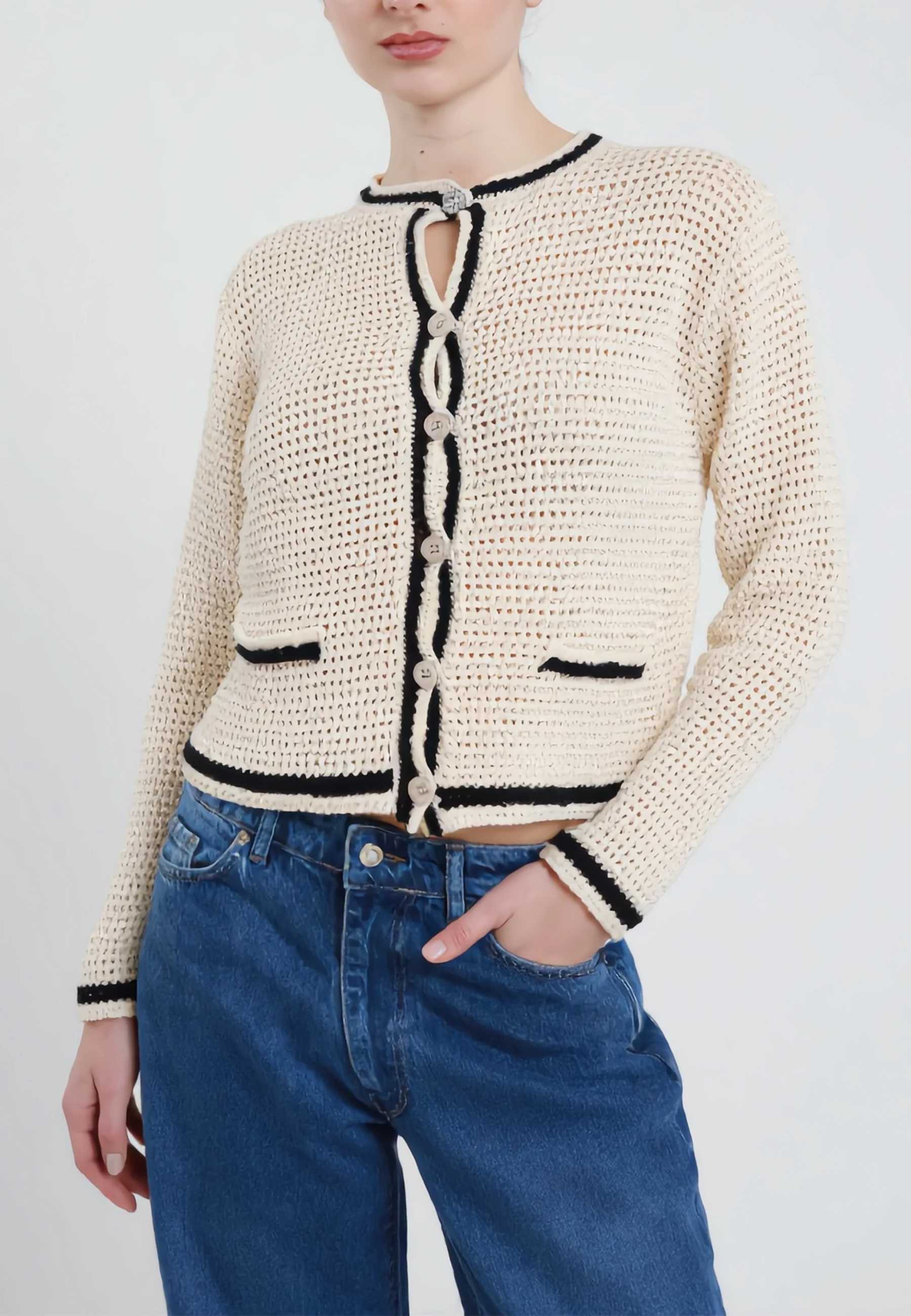 Cardigan donna SUSY MIX dal gusto contemporaneo e ricercato, perfetto per completare outfit femminili con un tocco distintivo e versatile. Il modello traforato dona leggerezza visiva al capo e lo rende ideale per la stagione estiva, mentre la linea morbida accompagna la silhouette con naturalezza. I bordi a contrasto valorizzano il design con un dettaglio grafico elegante e moderno, capace di dare carattere anche agli abbinamenti più semplici. La chiusura frontale con bottoni aggiunge praticità, mentre il bottone gioiello sullo scollo impreziosisce il cardigan con un accento raffinato e luminoso. Facile da indossare su top, t-shirt o abiti leggeri, è un capo pensato per il guardaroba quotidiano ma adatto anche a occasioni più curate. Questo cardigan donna interpreta perfettamente lo stile SUSY MIX, unendo comfort, femminilità e dettagli attuali in una proposta versatile, fresca e sempre piacevole da abbinare. Ideale per chi cerca un capo leggero e originale, capace di valorizzare il look con semplicità e personalità.