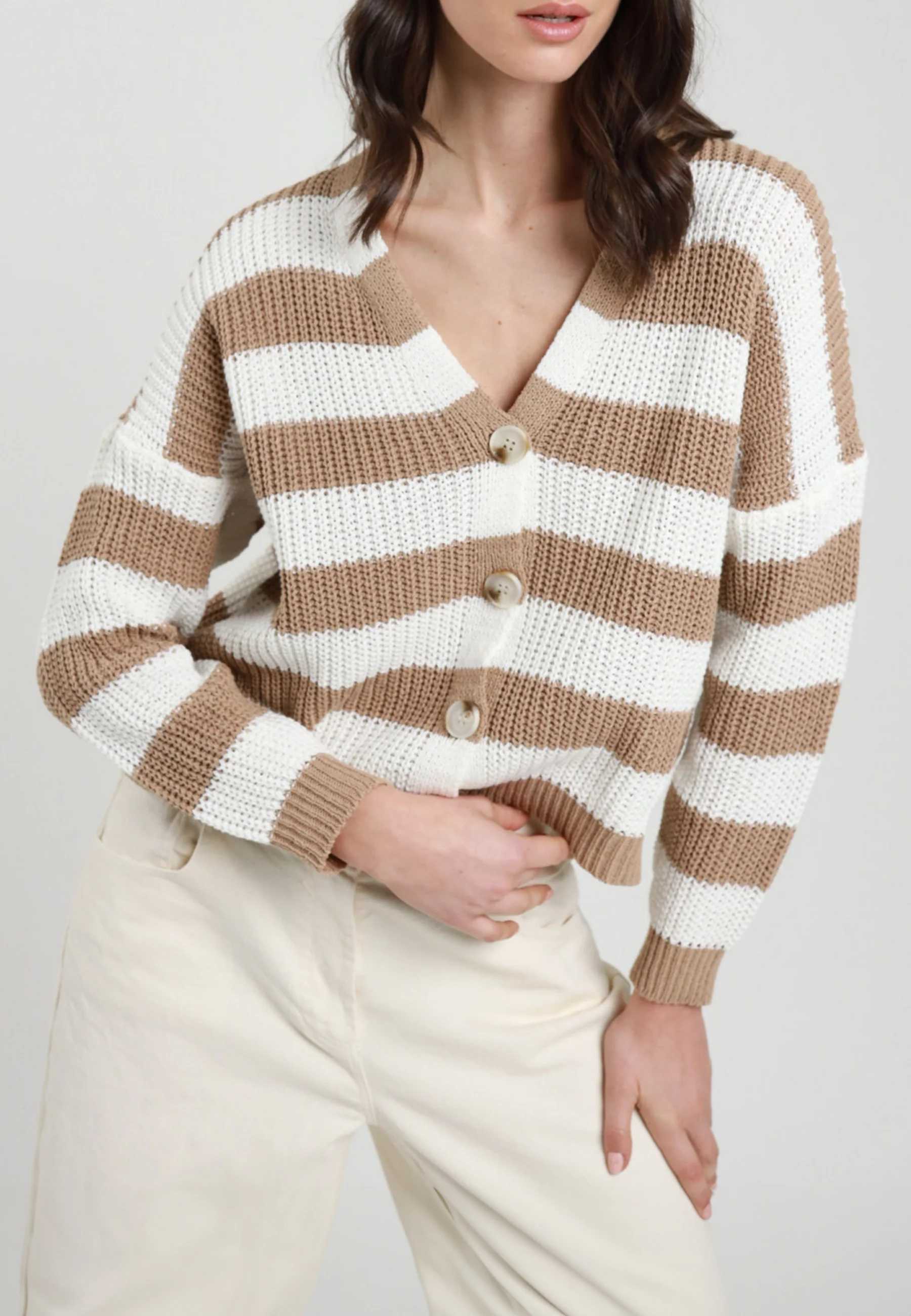 Cardigan donna SUSY MIX dal taglio morbido e dall’estetica contemporanea, ideale per completare con disinvoltura i look della bella stagione. La lavorazione in maglia valorizza il capo con una texture piacevole e leggera, mentre la fantasia a righe dona ritmo visivo e un carattere casual raffinato, perfetto per outfit quotidiani sempre curati. Il modello over accompagna la silhouette con comfort e naturalezza, lasciando ampia libertà di movimento e rendendo questo cardigan adatto a diversi abbinamenti, dai pantaloni in cotone ai jeans fino alle gonne più essenziali. Lo scollo a V e l’abbottonatura frontale aggiungono praticità e versatilità, permettendo di indossarlo sia aperto sia chiuso a seconda dello stile desiderato. Questo capo interpreta con equilibrio la femminilità dinamica di SUSY MIX, unendo linee moderne, dettagli semplici e una vestibilità rilassata. Perfetto per chi cerca un cardigan donna in maglia dal gusto fresco e attuale, capace di arricchire il guardaroba con un tocco casual, luminoso e facile da indossare ogni giorno.