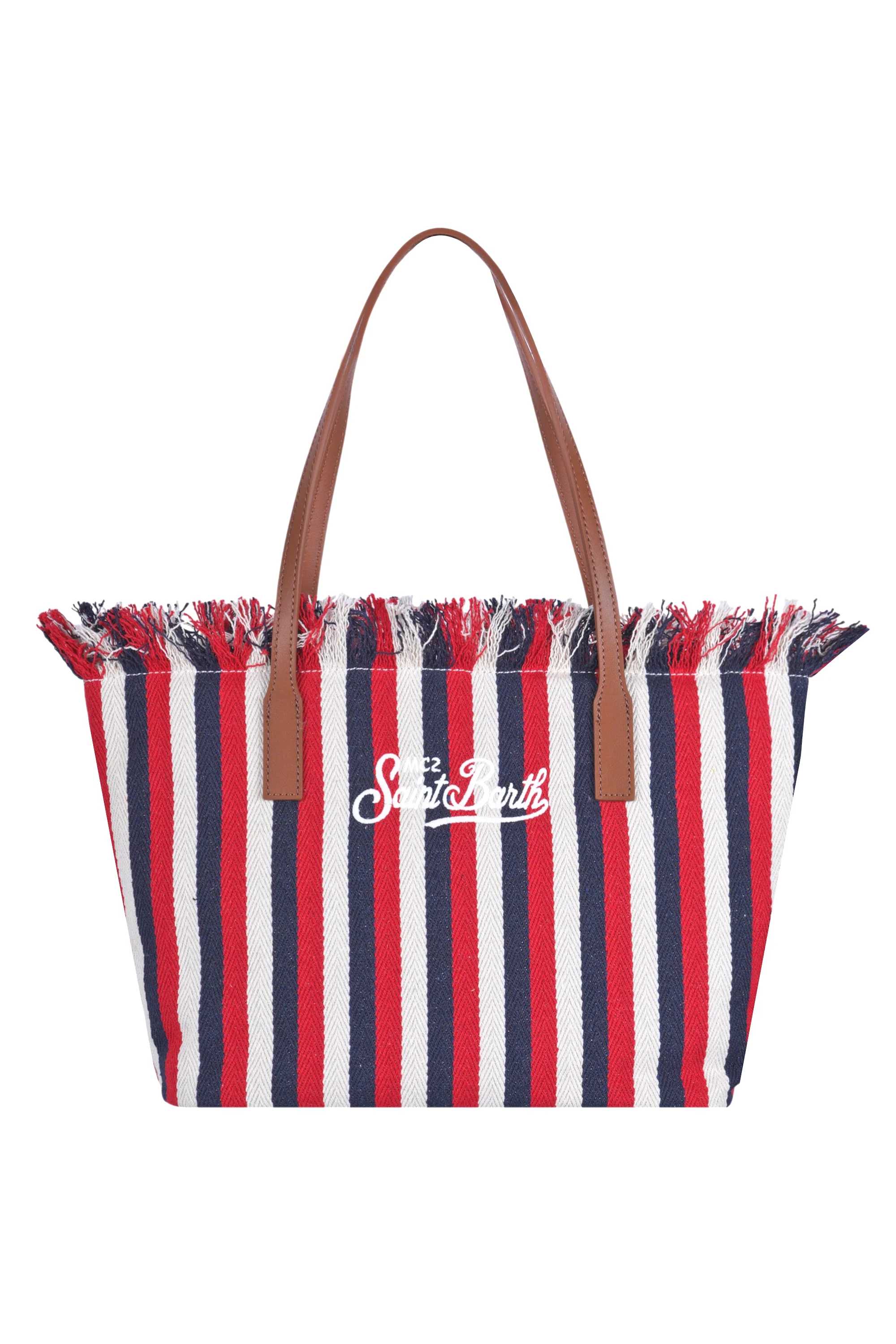 Stile estivo: Perfetta per la stagione grazie alle righe verticali e alle frange lungo il bordo. Versatile: Adatta per completare look casual o più ricercati. Robusta: Realizzata in resistente tela di cotone per un utilizzo duraturo. Dettagli di design: Manici in similpelle marrone e logo ricamato donano un tocco elegante. Pratica: Chiusura con zip e tasca interna per tenere al sicuro i tuoi effetti personali. Accessorio alla moda: Porta il trend delle righe con stile e personalità. Brand di prestigio: Il marchio MC2 Saint Barth garantisce qualità e stile riconosciuto. - Borsa City Bag Mid a righe. Realizzata in tela di cotone a righe. Motivo a righe verticali. Dettaglio di frange lungo il bordo superiore. Manici superiori in similpelle marrone. Logo MC2 Saint Barth ricamato sul fronte. Chiusura con zip. Tasca interna con zip. Composizione: 100% cotone. Una borsa versatile e alla moda, perfetta per un tocco di stile estivo.Nessuna informazione disponibile