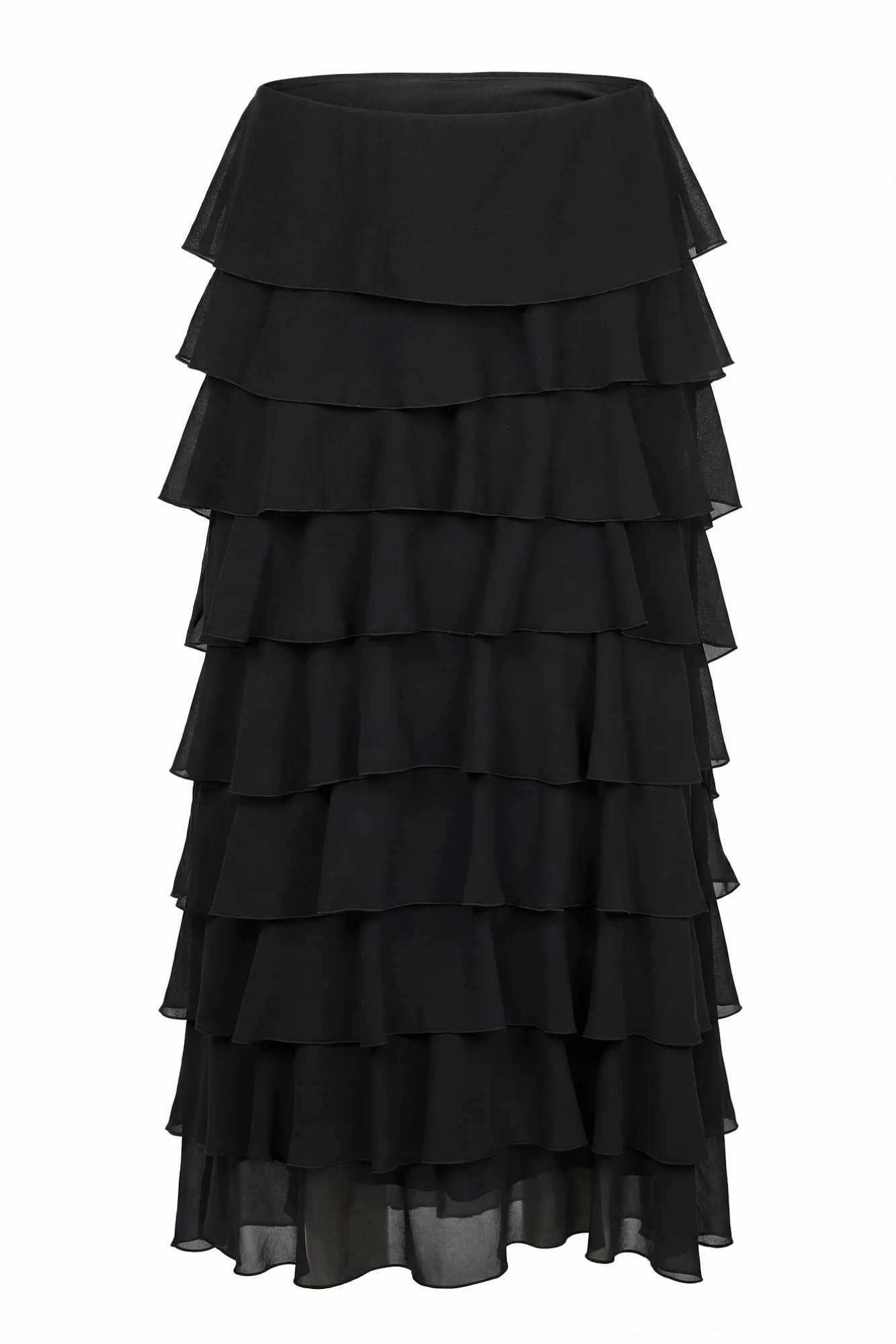 Gonna lunga a balze in georgette. Design a balze. Vita alta. Banda elastica sul retro. Taglio dritto. Orlo più lungo nel retro. Composizione tessuto: 100% poliestere. Vestibilità: regolare. Made in Italy. La modella indossa una taglia 40 ed è alta 175 cm. Un capo leggero e svolazzante, perfetto per un look romantico e raffinato.Nessuna informazione disponibile
