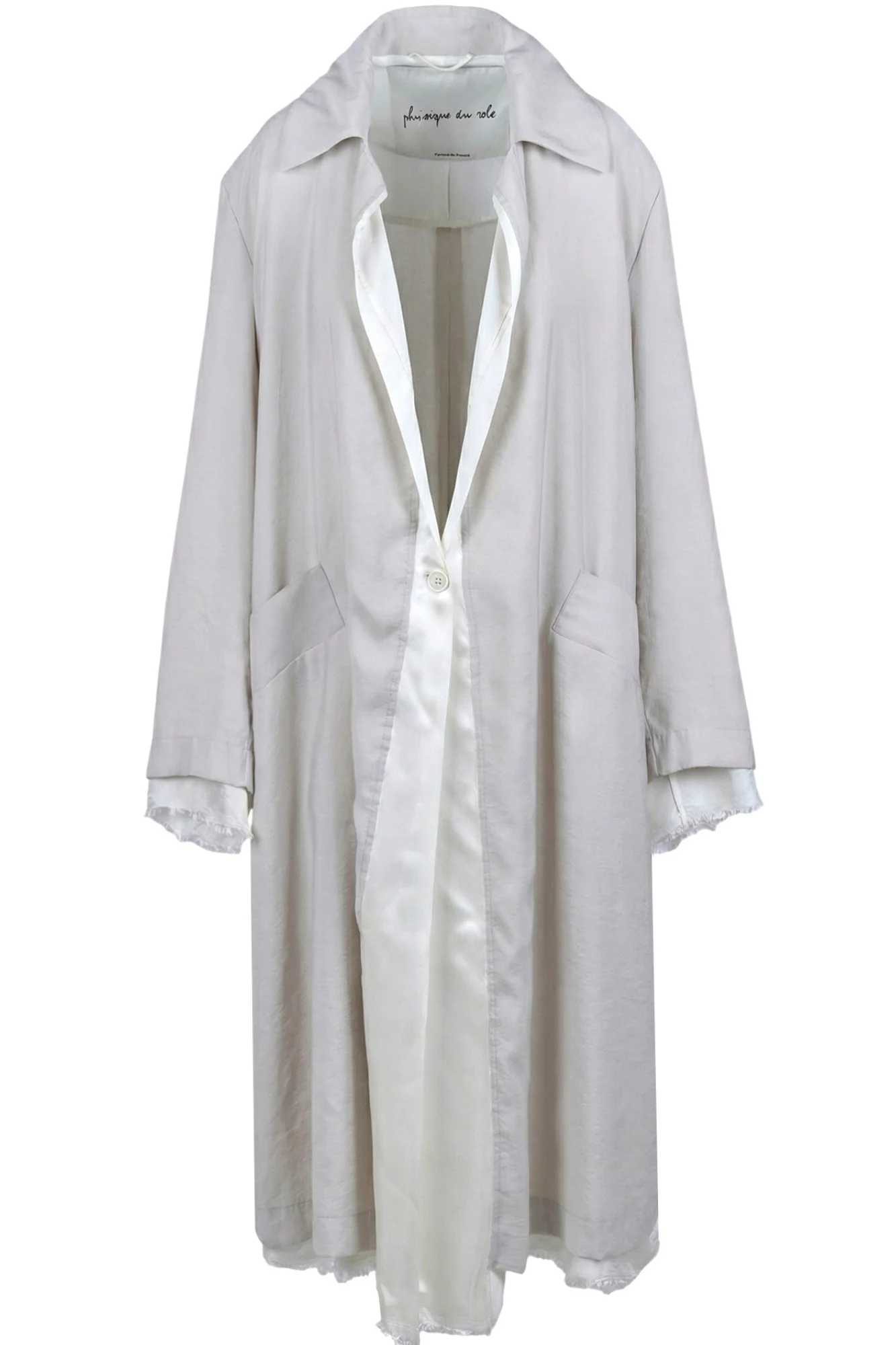 Spolverino lungo con bordi sfrangiati. Collo con revers. Spalle scese. Maniche lunghe con polsini sfrangiati in tessuto a contrasto. Chiusura frontale con un bottone. Inserto frontale con tessuto a contrasto. Due tasche applicate sul fronte. Foderato. Orlo inferiore sfrangiato. Composizione tessuto: 85% modal riciclato; 15% poliestere. Vestibilità: regolare. Made in Italy. La modella indossa una taglia 0 ed è alta 175 cm. Un capo versatile e leggero, perfetto per un look sofisticato e disinvolto.Nessuna informazione disponibile