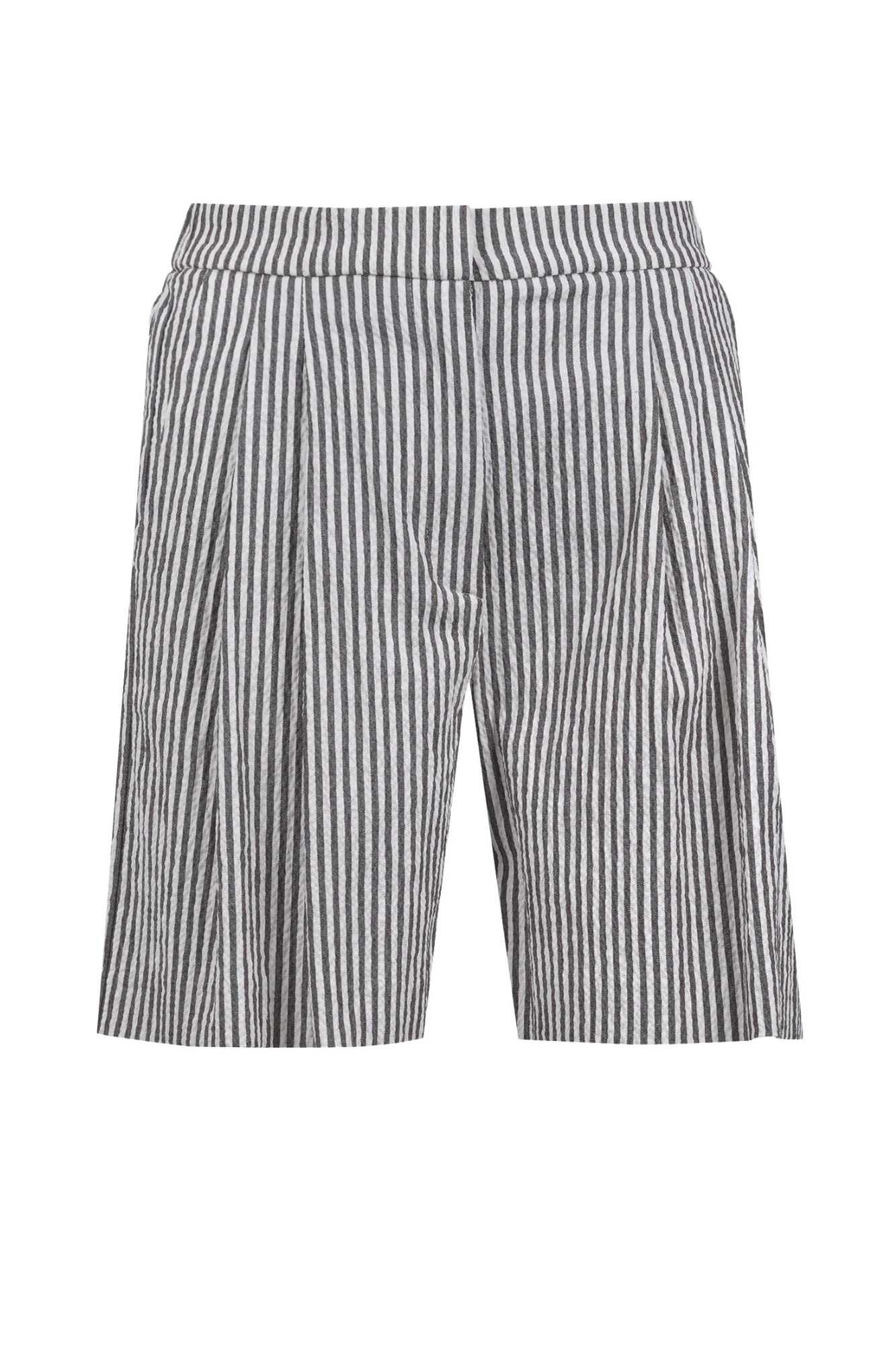 Shorts a righe in tessuto testurizzato. Vita alta elasticizzata sul retro. Chiusura frontale con zip e bottone nascosti. Pinces frontali. Tasche laterali oblique. Tasca a filetto con bottone sul retro Tessuto testurizzato. Gamba ampia. Larghezza fondo: 36 cm. Composizione tessuto: 80% Cotone; 19% Poliestere; 1% Elastan. Vestibilità: regolare. Made in Italy. La modella indossa una taglia 40 ed è alta 175 cm. Perfetti per un look estivo chic e confortevole.Nessuna informazione disponibile