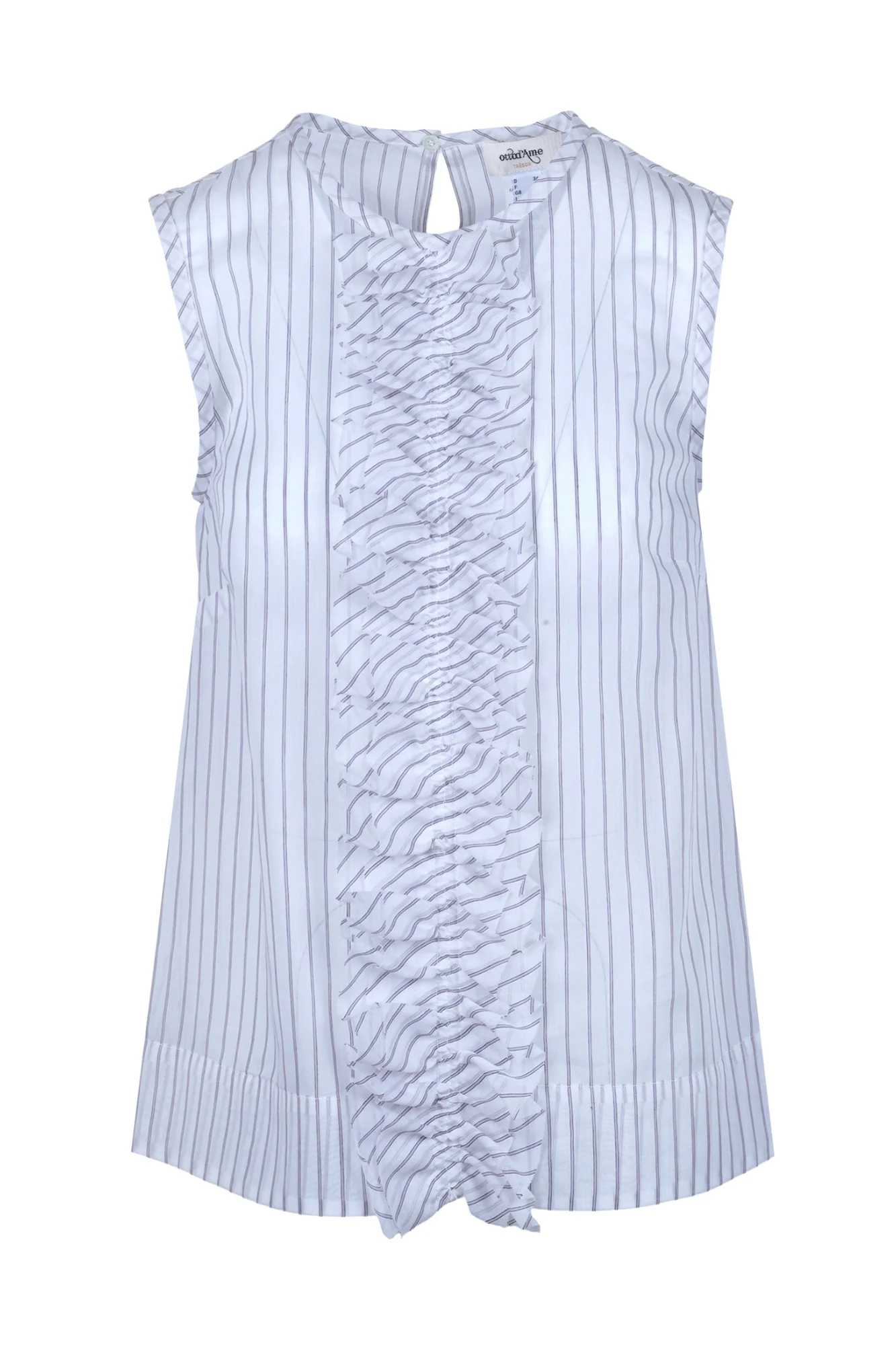Top a righe con volant. Scollo rotondo. Senza maniche. Chiusura con bottoncino sul retro del collo. Dettaglio volant centrale arricciato sul davanti. Fantasia a righe. Tessuto semi trasparente. Composizione tessuto: 58% cotone; 31% poliammidica; 11% viscosa. Vestibilità: regolare. Made in Italy. La modella indossa una taglia 40 ed è alta 175 cm. Un capo versatile e chic, perfetto per aggiungere un tocco di eleganza a qualsiasi outfit estivo.Nessuna informazione disponibile