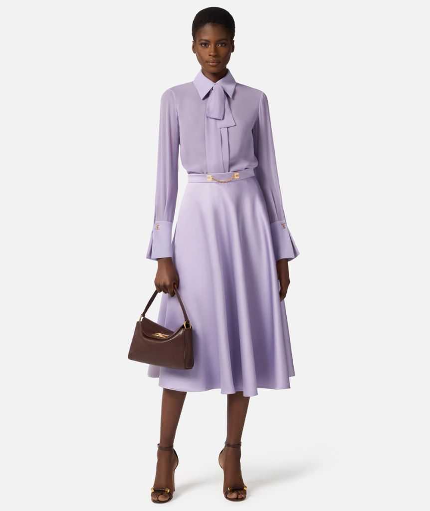 Gonna in duchesse. Il fascione in vita è impreziosito dalla catenella con logo in metallo dorato. Il design a ruota regala una silhouette dinamica e raffinata. Vestibilità regular.
