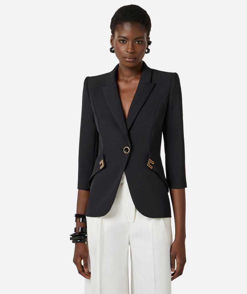 Giacca in doppio crêpe stretch con spalle strutturate, rever a lancia e maniche ¾. Il blazer si distingue per i tagli diagonali sui fianchi, impreziositi dai dettagli con logo in metallo dorato e smaltati internamente. Vestibilità slim.