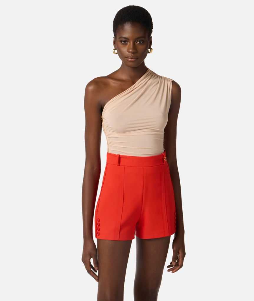 Top in jersey con design monospalla. Si distingue per il drappeggio laterale che crea movimento sul fianco, esaltato dalla zip in metallo dorato. Vestibilità aderente.