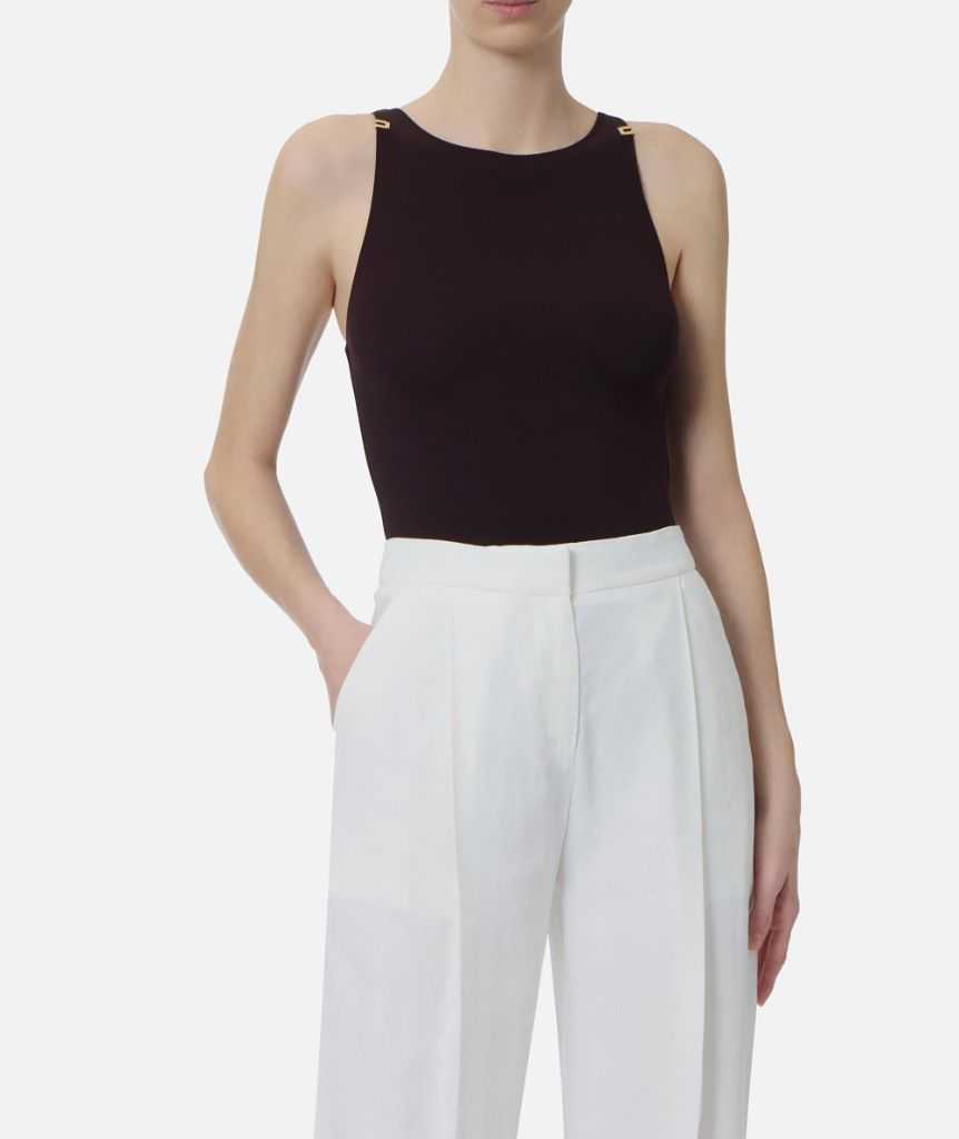 Body smanicato in jersey crêpe. Dalla linea essenziale, è arricchito dai dettagli con logo in metallo dorato posizionati sulle spalle. Retro con schiena scoperta per una nota sensuale. Vestibilità aderente.