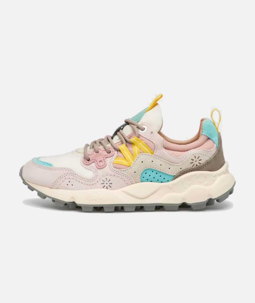 Femminilità e spirito outdoor si fondono in un design attuale, perfetto da abbinare alle mise active quanto alle longuette più glamour: Yamano è la sneaker dalla tomaia in pelle caratterizzata da inserti in tessuto tecnico e dall'iconico occhiello dalla forma sagomata, ispirata al fiore del tarassaco. Le linee evocano le calzature trekking, con suola in gomma ultra leggera e battistrada dentellato. La soletta interna in sughero naturale antibatterico assicura benessere al piede e comfort all day long.