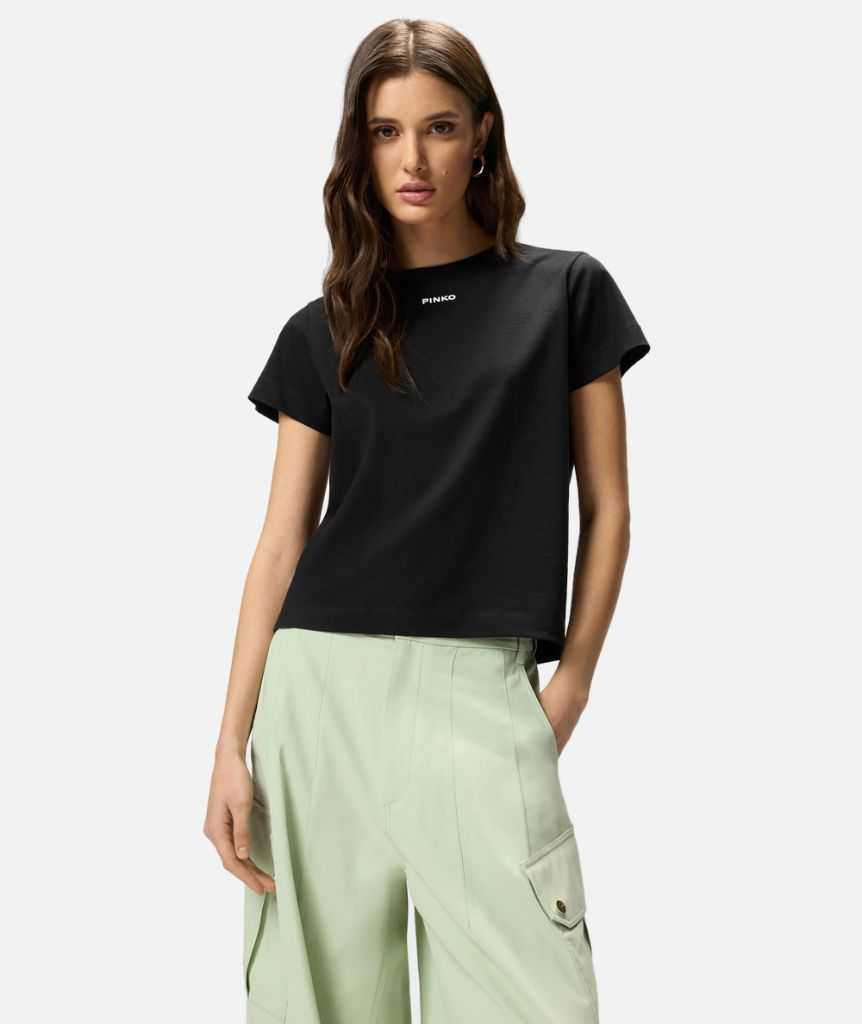 T-shirt girocollo a maniche corte realizzata in jersey di puro cotone. Il modello è personalizzato dal logo lettering PINKO in rilievo dall'effetto verniciato a contrasto sul petto. Essenziale e contemporanea, questa T-shirt diventerà un vero e proprio passe-partout del tuo guardaroba estivo e non solo.