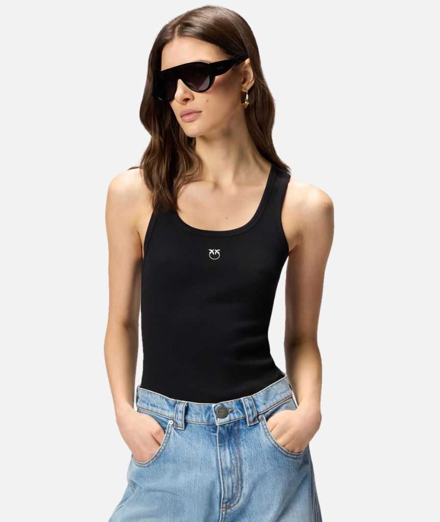 Canotta realizzata in morbido jersey di cotone stretch lavorato a costine sottili e impreziosita da un'applicazione dorata con logo Love Birds sul petto, per un tocco di luce in puro stile PINKO. Il capo risulta particolarmente versatile, abbinalo con facilità a una gonna raffinata o a dei jeans per le occasioni più informali.