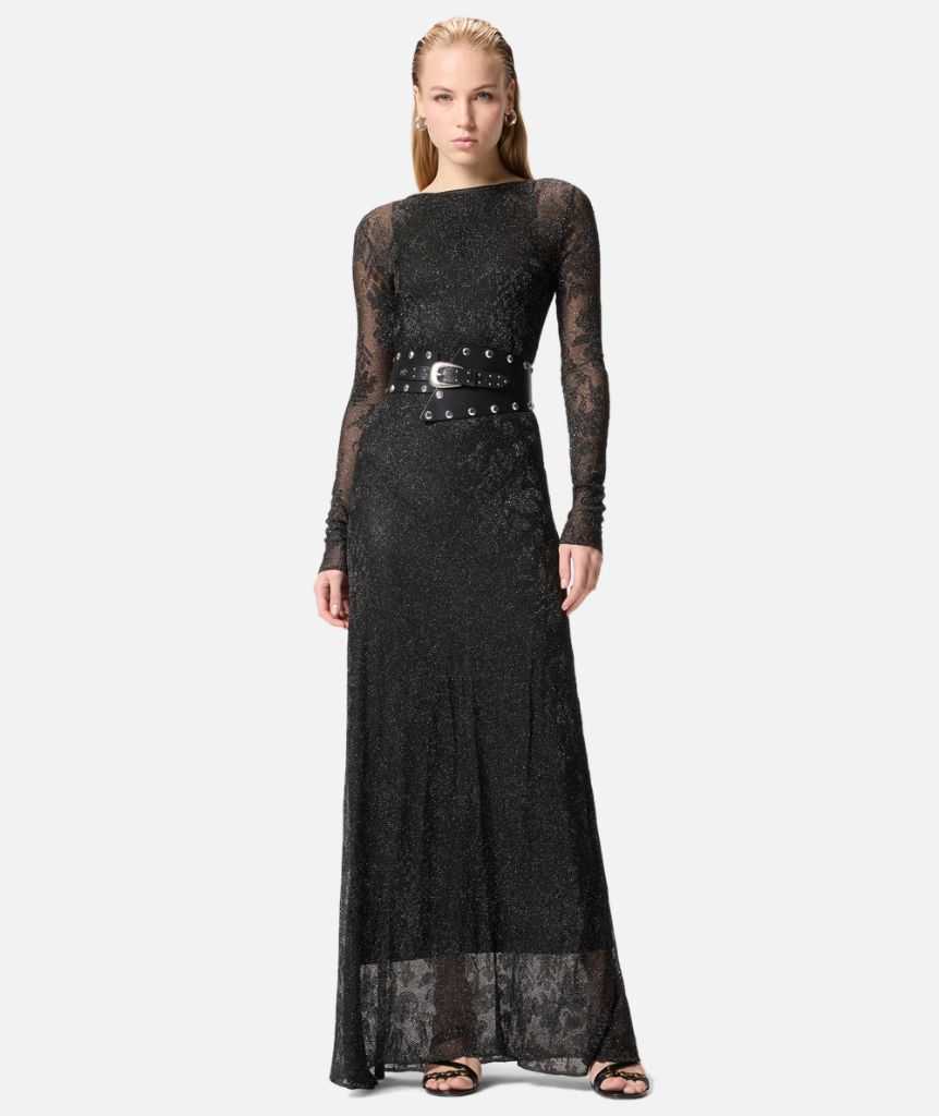 Abito lungo con parte superiore più aderente e gonna morbida, leggermente svasata al fondo. Il modello mostra una ricchezza di dettagli e lavorazioni senza pari: alla fodera interna smanicata con profondo scollo sul retro, pensata per bilanciare le trasparenze, è sovrapposto uno strato realizzato in un particolare tessuto jacquard a rete con fibra metallizzata, decorato da un disegno floreale in rilievo dal raffinato effetto pizzo. Questo rivestimento velato è completato da maniche lunghe, scollo leggermente a barchetta e tre cut-out out sul retro che lasciano intravedere la schiena scoperta: indossa il vestito con un paio di décolleté o di sandali alti per comporre look da sera preziosi e sensuali.