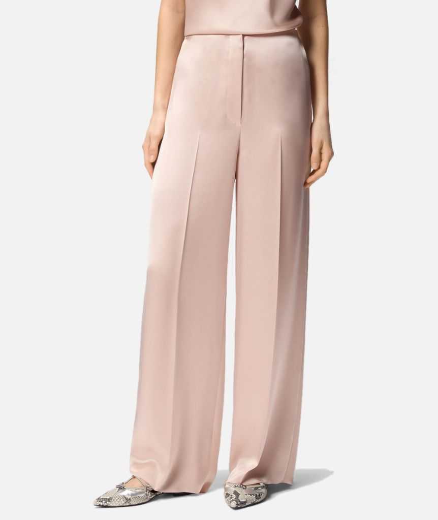 Pantaloni realizzati in morbido e lucente satin double face, per un aspetto raffinato e uniforme sia all'esterno sia all'interno. Il capo, dalla linea fluida e scivolata, è completato da una chiusura con zip e gancio nascosti, due tasche laterali, due tasche posteriori a filetto e un'elegante piega stirata. Indossa questi pantaloni con la giacca coordinata per creare un total look femminile ideale per le occasioni formali.