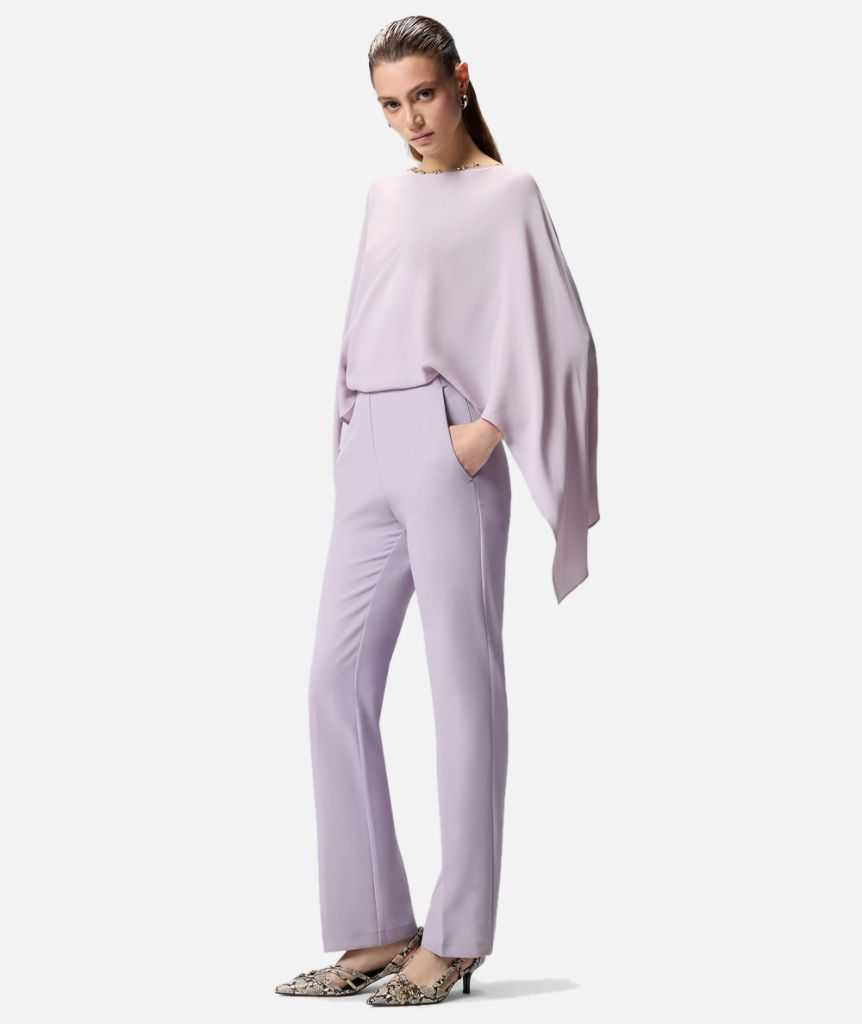 Tuta caratterizzata da pantaloni lunghi e dritti con piega stirata fronte e retro, e da una parte superiore con ampie maniche a pipistrello, scollo leggermente a barchetta sul davanti e profondo scollo sul retro che lascia la schiena scoperta. Il capo presenta una costruzione bimateriale che crea un raffinato contrasto di texture, accostando un tessuto crêpe più tecnico e strutturato per i pantaloni, e un morbido tessuto crêpe de Chine di misto seta per la parte superiore. Per questo modello dall'elegante design monocromatico, PINKO propone una personalizzazione raffinata e femminile: una sottile collana rimovibile con piccole boule metalliche da far ricadere al centro della schiena. Questa tuta elegante è chiusa da una zip laterale invisibile, che mantiene la silhouette pulita e la rende perfetta sia per cerimonie, sia per serate speciali in cui è richiesto un dress code elevato.