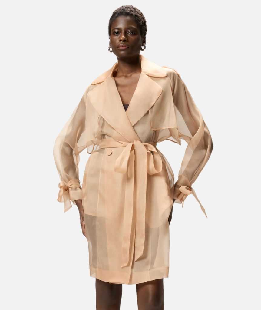 Trench realizzato in organza di pura seta, un tessuto leggero e trasparente che dona volume al capo, per un raffinato mix di funzionalità e sensualità. Il modello non rinuncia ai dettagli dei trench classici: è infatti caratterizzato da ampi revers, alamari sulle spalle, patte antivento sul davanti, cinturini da annodare ai polsi e una cintura abbinata da annodare in vita. Grazie alla composizione e alla linea morbida il trench si presta a giochi di sovrapposizioni originali, per creare outfit quotidiani dall'effetto decisamente femminile.