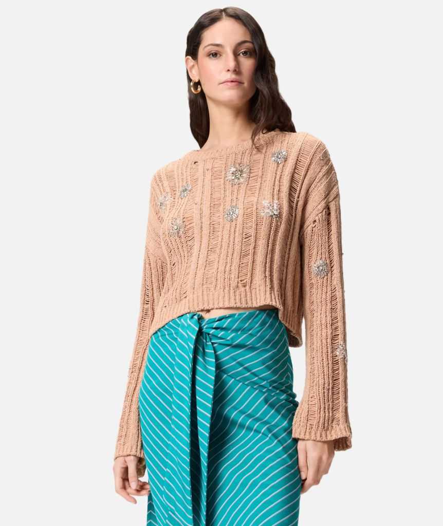 Maglione girocollo dal taglio cropped realizzato in misto cotone dalla mano fresca e morbida con una particolare lavorazione traforata. I dettagli floreali formati da cristalli e paillettes applicati a mano illuminano il design, rendendo un capo da tutti i giorni un vero alleato di stile.