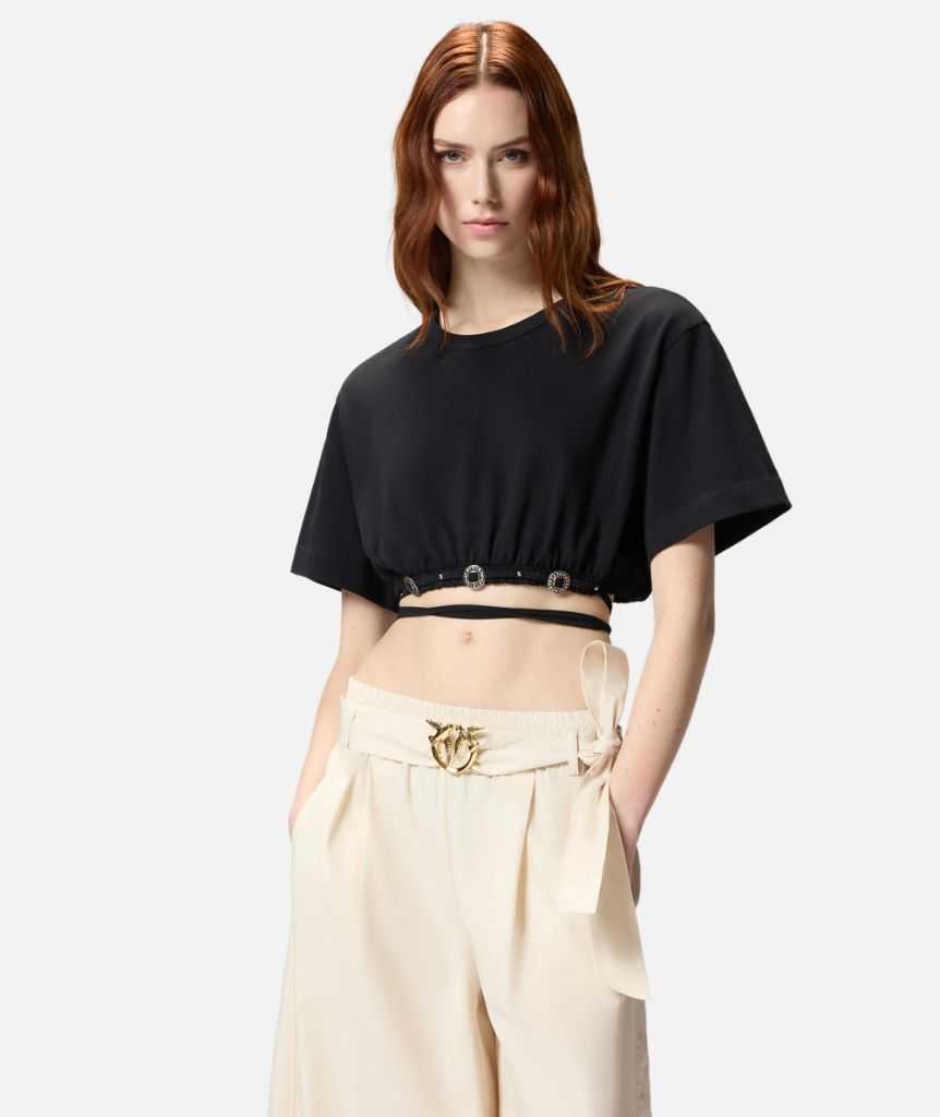 T-shirt cropped a mezza manica realizzata in jersey doppio di puro cotone dalla mano morbida e compatta. Il modello è caratterizzato da un fondo elasticizzato con un laccio da avvolgere attorno alla vita e annodare a piacimento, impreziosito da micro borchie e fibbie a passante d'ispirazione texana con finitura color argento invecchiato. Indossa la T-shirt con i pantaloni abbinati per un look estivo che non lascia niente al caso.