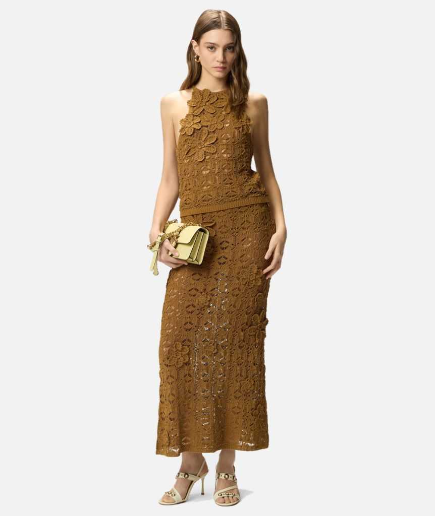 Gonna midi dalla linea dritta e morbida dotata di una comoda fascia in vita e personalizzata dall'etichetta con logo lettering PINKO sul retro. Il capo, realizzato in un filato di misto cotone dalla mano fluida, è interamente lavorato a crochet ed è reso speciale da fiori di diverse dimensioni, anch'essi lavorati a crochet, applicati a mano, per un effetto finale tridimensionale e femminile. Il modello è foderato per assicurare un maggiore comfort durante l'indosso. Grazie all'aspetto traforato tipico delle creazioni all'uncinetto e alla texture incredibilmente piacevole a contatto con la pelle, questa gonna è ideale per accompagnarti nei tuoi outfit della bella stagione: provala con il top coordinato per un total look da indossare a più riprese, in città come al mare.