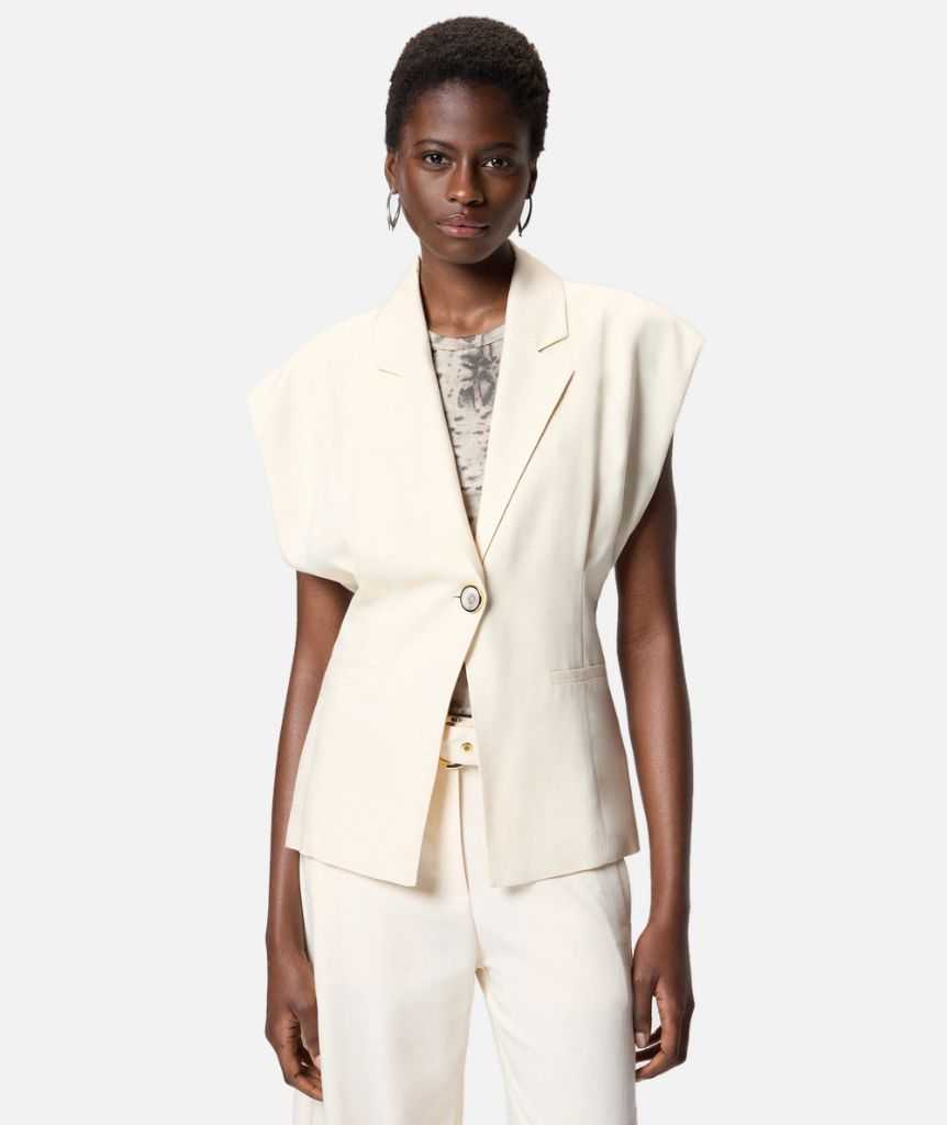Giacca dal design smanicato realizzata in un tessuto panama che richiama l'inconfondibile aspetto rustico del lino, per un look elegante e disinvolto. Il capo presenta una chiusura monopetto a un bottone, ed è caratterizzato da revers classici, due raffinate tasche a filetto e pinces sul fronte e sul retro che modellano la vita. La fodera ton sur ton realizzata in puro cotone assicura un maggiore comfort durante l'indosso. Indossa questa giacca con la gonna coordinata per creare un total look femminile ideale per le occasioni formali.