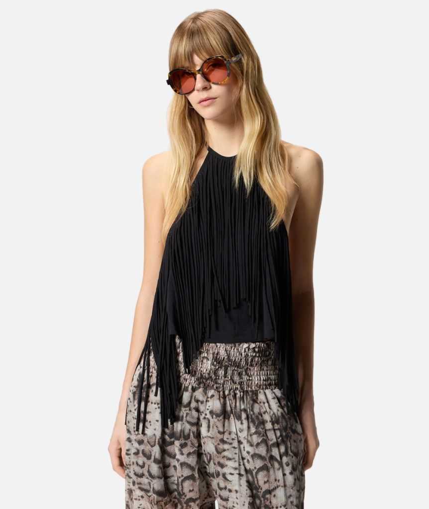 Top leggermente cropped in tela di viscosa lavata dall'aspetto increspato, caratterizzato da uno scollo all'americana che lascia la schiena scoperta e che si chiude sul retro del collo tramite due morbidi nastri da annodare. Il modello presenta un design fresco e femminile in puro stile PINKO, e si distingue per le lunghe frange tubolari fatte a mano che ricadono su tutta la parte frontale, accompagnando i tuoi movimenti con naturalezza. L'elegante effetto semilucido del tessuto e la dinamicità della decorazione rendono questo capo la scelta ideale per una festa in spiaggia o per un pool party esclusivo.