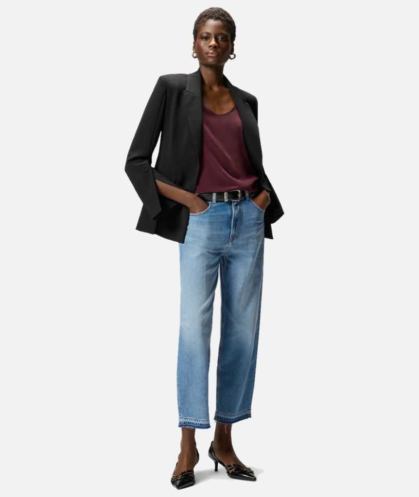 Jeans cinque tasche a vita bassa balloon fit, con gamba arrotondata nella parte superiore e più stretta al fondo. Il modello è realizzato in denim di cotone e lyocell con tono di lavaggio medio e scoloriture per un accattivante aspetto vissuto, ed è rifinito dal fondo gamba trattato a riserva, per un effetto destrutturato. Il lavaggio più scuro del quinto taschino, della salpa e del fondo capo crea un contemporaneo gioco di contrasti in puro stile PINKO, mentre l'iconico logo Love Birds spicca sotto forma di ricamo su una delle tasche posteriori. Indossa questi jeans con la giacca abbinata per un look total denim dallo stile contemporaneo, oppure con la tua T-shirt preferita per un mix casual e disinvolto, perfetto per ogni occasione.