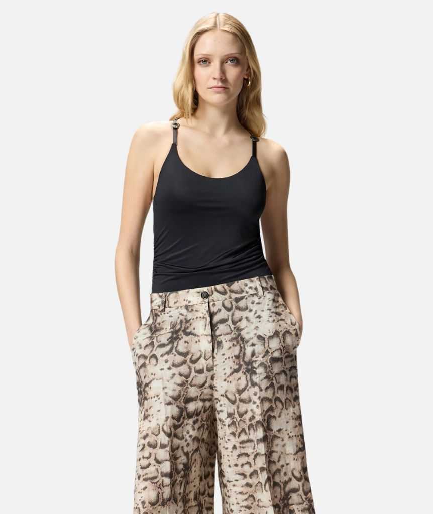 Body realizzato in tessuto doppiato in maglina dall'aspetto lucido che dà origine a morbide arricciature. Il modello, con scollo tondo, è caratterizzato da spalline effetto pelle regolabili che si incrociano sul retro, impreziosite da fibbie a passante in stile texano dalla finitura color argento invecchiato. Abbina questo capo grintoso e versatile alle cinture coordinate della stessa collezione, per un look che non lascia nulla al caso.