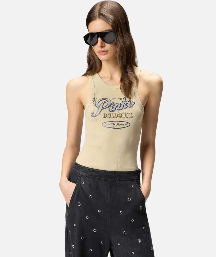 Top a canotta con collo tondo, realizzato in cotone stretch a costine e caratterizzato da una stampa frontale Pinko Bold Soul dall'effetto vintage. Un capo basico del guardaroba rivisitato in chiave PINKO, per creare outfit quotidiani funzionali e femminili al tempo stesso.
