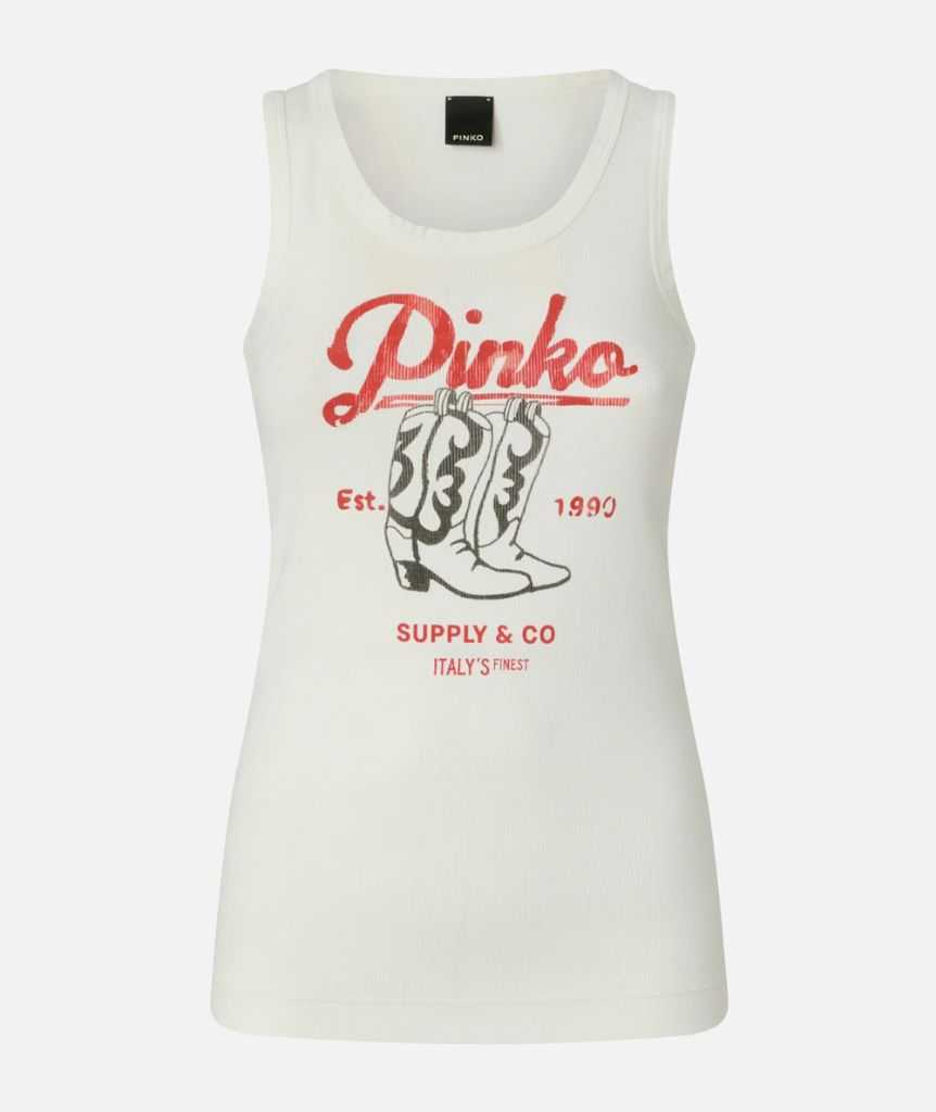 Top a canotta in cotone stretch a costine caratterizzato da una stampa frontale con stivali texani e logo lettering del brand dall'effetto vintage. Un capo basico del guardaroba rivisitato in chiave PINKO, per creare outfit quotidiani funzionali e femminili al tempo stesso.