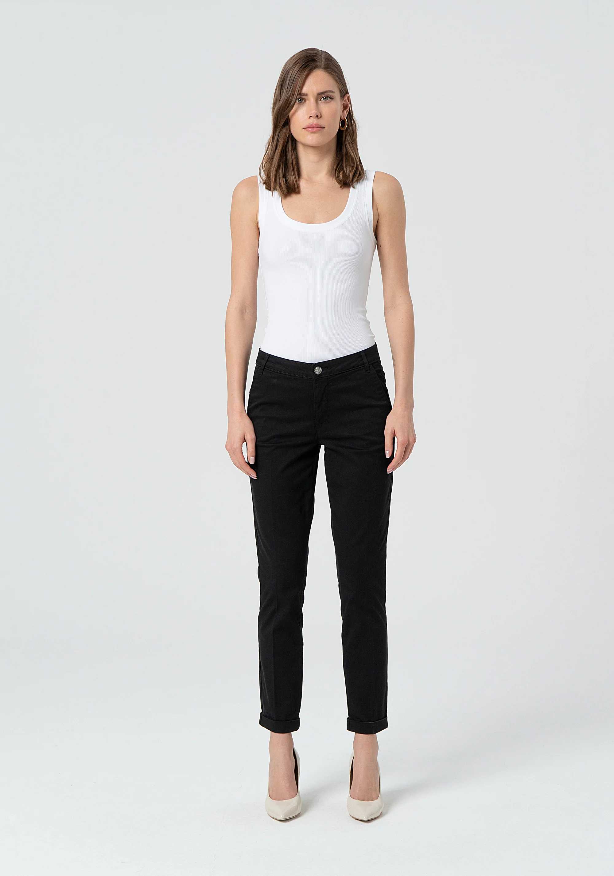 Pantalone regular in raso, vita regolare, tasche alla francese sul davanti, tasche a filetto sul retro, e con fondo dritto con risvolto.