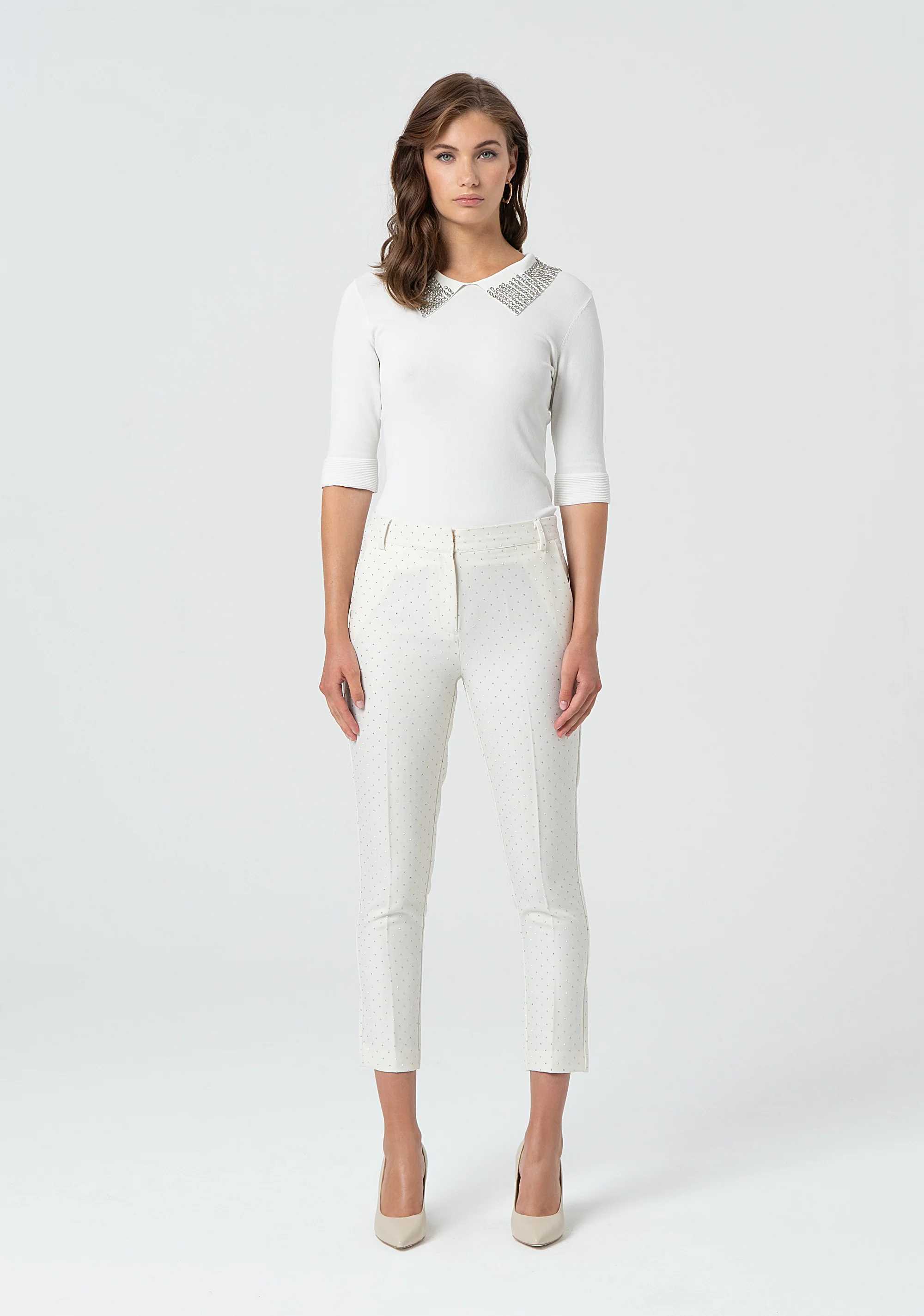 Pantalone chino a sigaretta con strass, vita regolare, tasche alla francese, tasche a filetto dietro, e con fondo dritto.