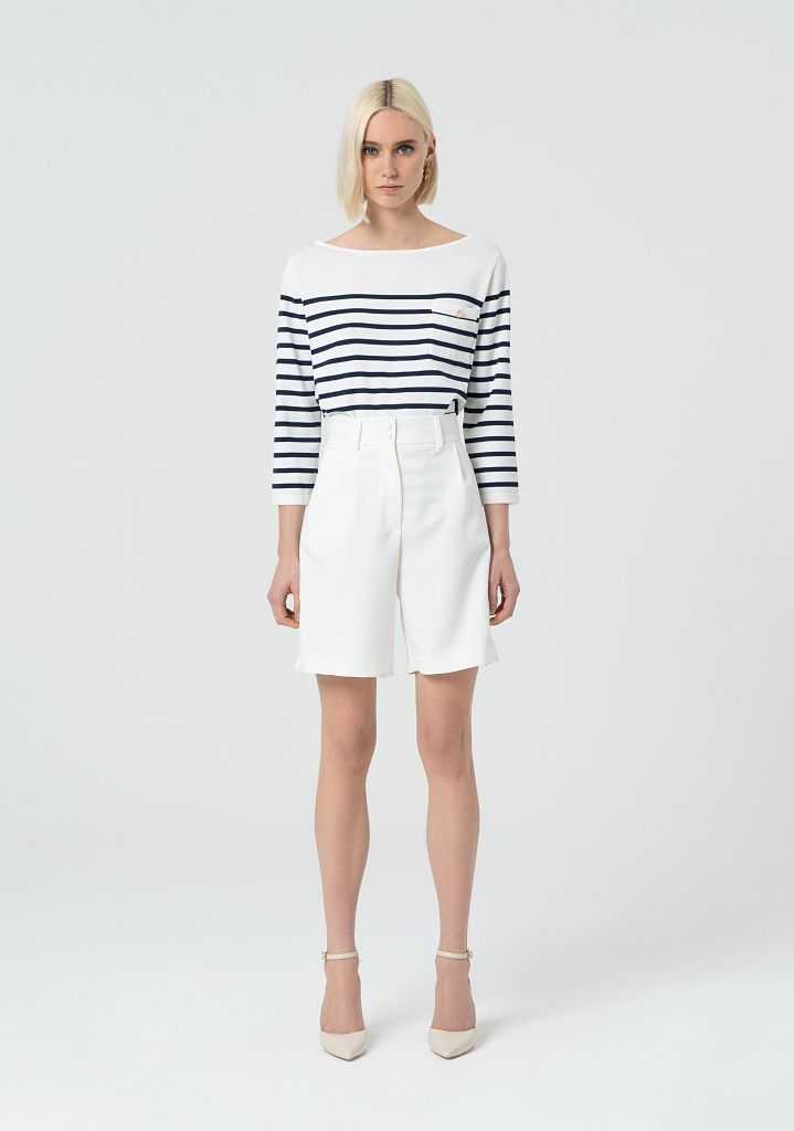 Bermuda regular con vita regolare, pences, tasche alla francese sul davnti, tasche a filetto sul retro, e con fondo ampio.