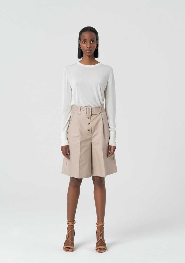 Bermuda flare in popeline di cotone, vita alta con cintura, bottoni a vista, tasche alla francese davanti, tasche a filetto sul retro, e con fondo ampio.