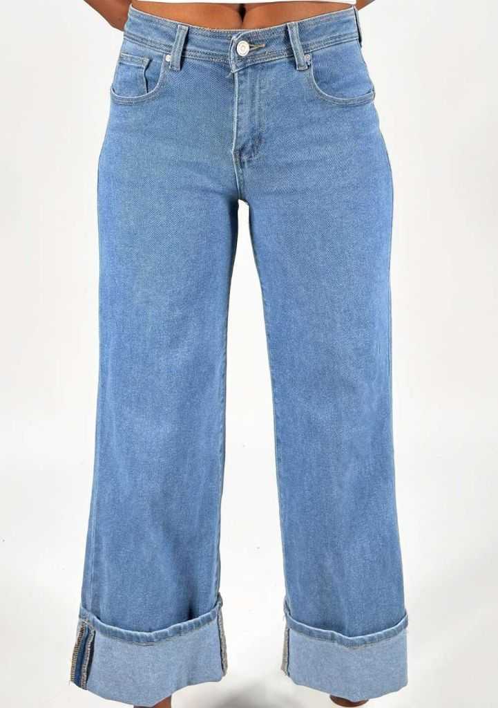 Jeans modello palazzo realizzato in denim. Il capo presenta una chiusura frontale tramite zip metallica e bottone. Il fondo è definito da un ampio risvolto. Composizione: 76% Cotone, 22% Poliestere, 2% Elastomero Vestibilità: Regular Stagione: Primavera / Estate Modella: La modella è alta 180 cm ed indossa la taglia S