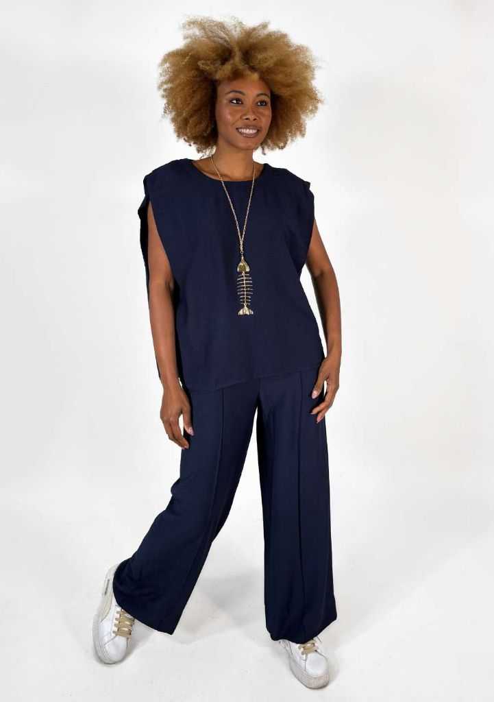 Completo coordinato in viscosa tinta unita, composto da maglia e pantaloni palazzo. Il set presenta una linea morbida e fluida, realizzato in viscosa leggera che garantisce comfort e vestibilità naturale. La maglia ha una costruzione essenziale, mentre i pantaloni palazzo completano il look con gamba ampia e vita elasticizzata. Composizione: 87% Viscosa, 13% Nylon Vestibilità: Regular Stagione: Primavera / Estate Modella: La modella è alta 180 cm ed indossa la taglia unica