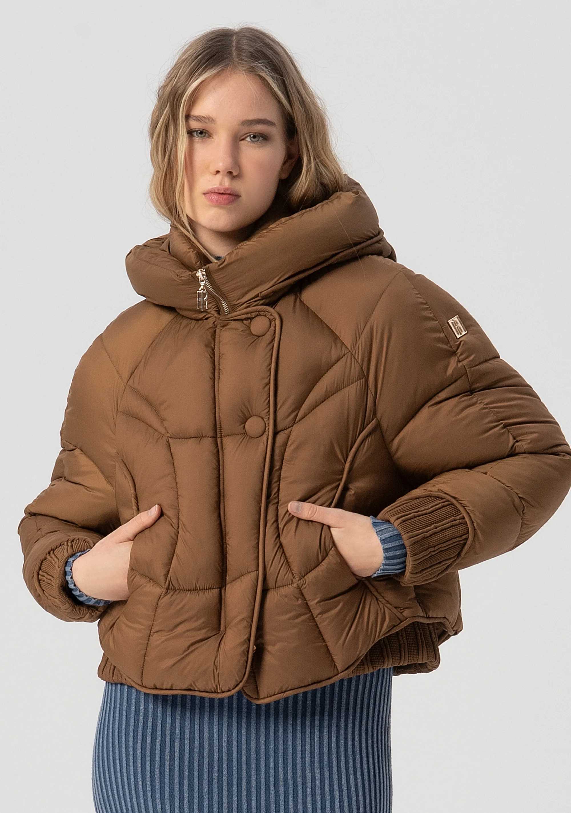 Piumino regolare imbottito in nylon, chiusura centrale, tasche laterali, cappuccio, e con maniche lunghe.