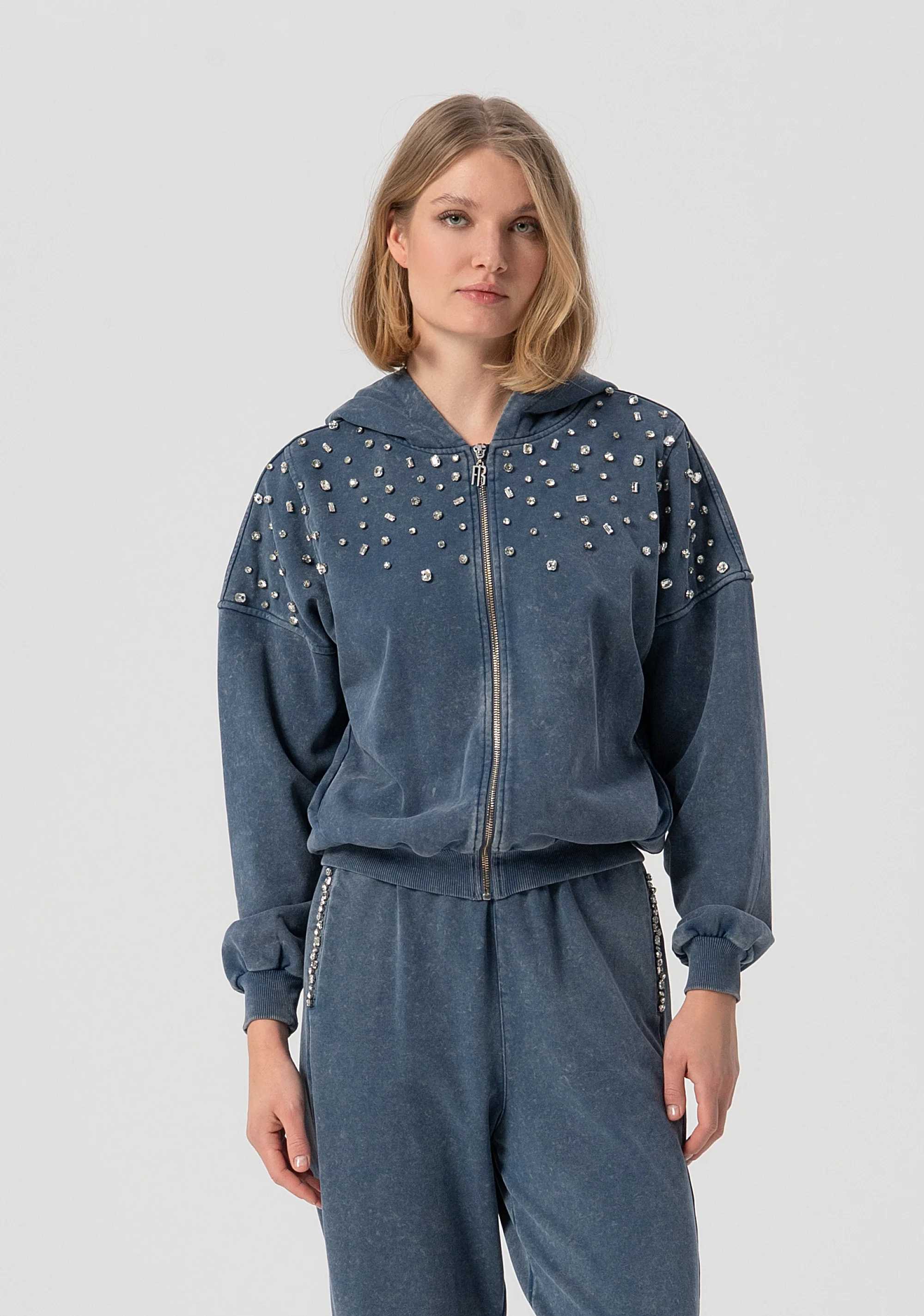 Felpa regular con cappuccio, pietre gioiello applicate, tessuto con effetto used, zip centrale per apertura, e con maniche lunghe.