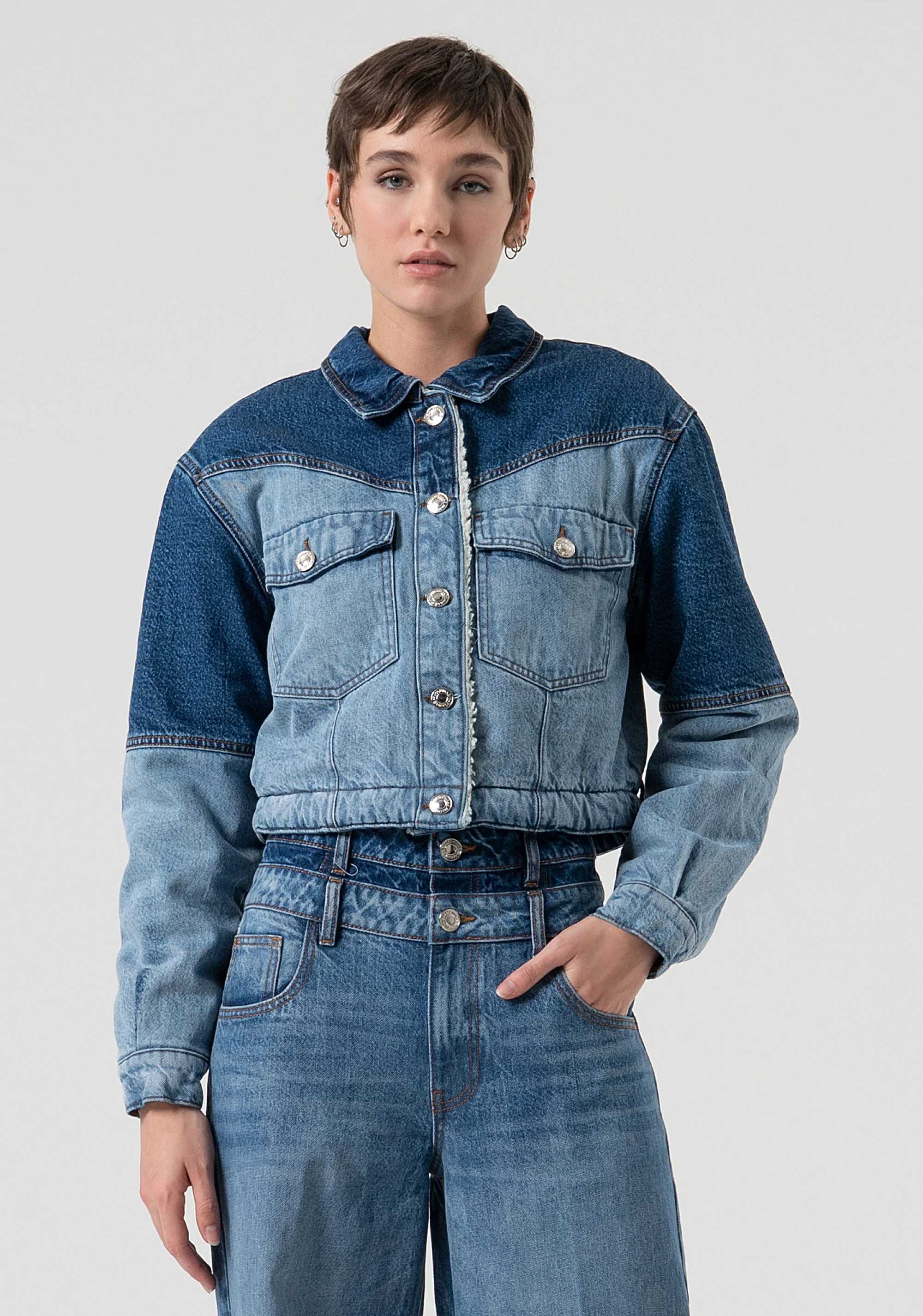Giacca imbottita regular in denim con lavaggio vintage, interno in finta pelliccia, colletto classico, bottoni centrali per apertura, tasche applicate sul davanti, e con maniche lunghe.