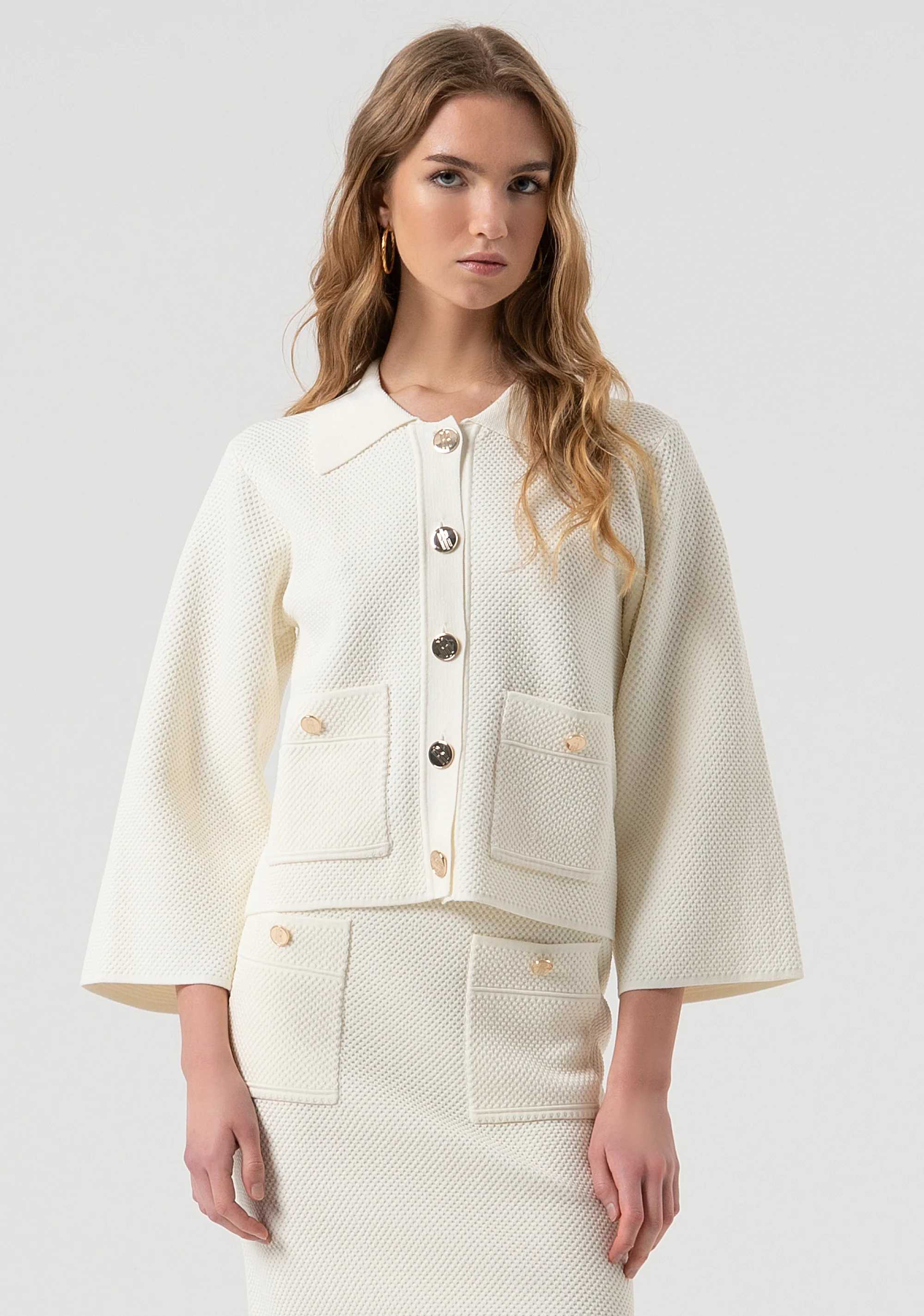Giacca regular in maglia con punto riso, colletto classico, bottoni centrali per apertura, tasche applicate, e con maniche lunghe.
