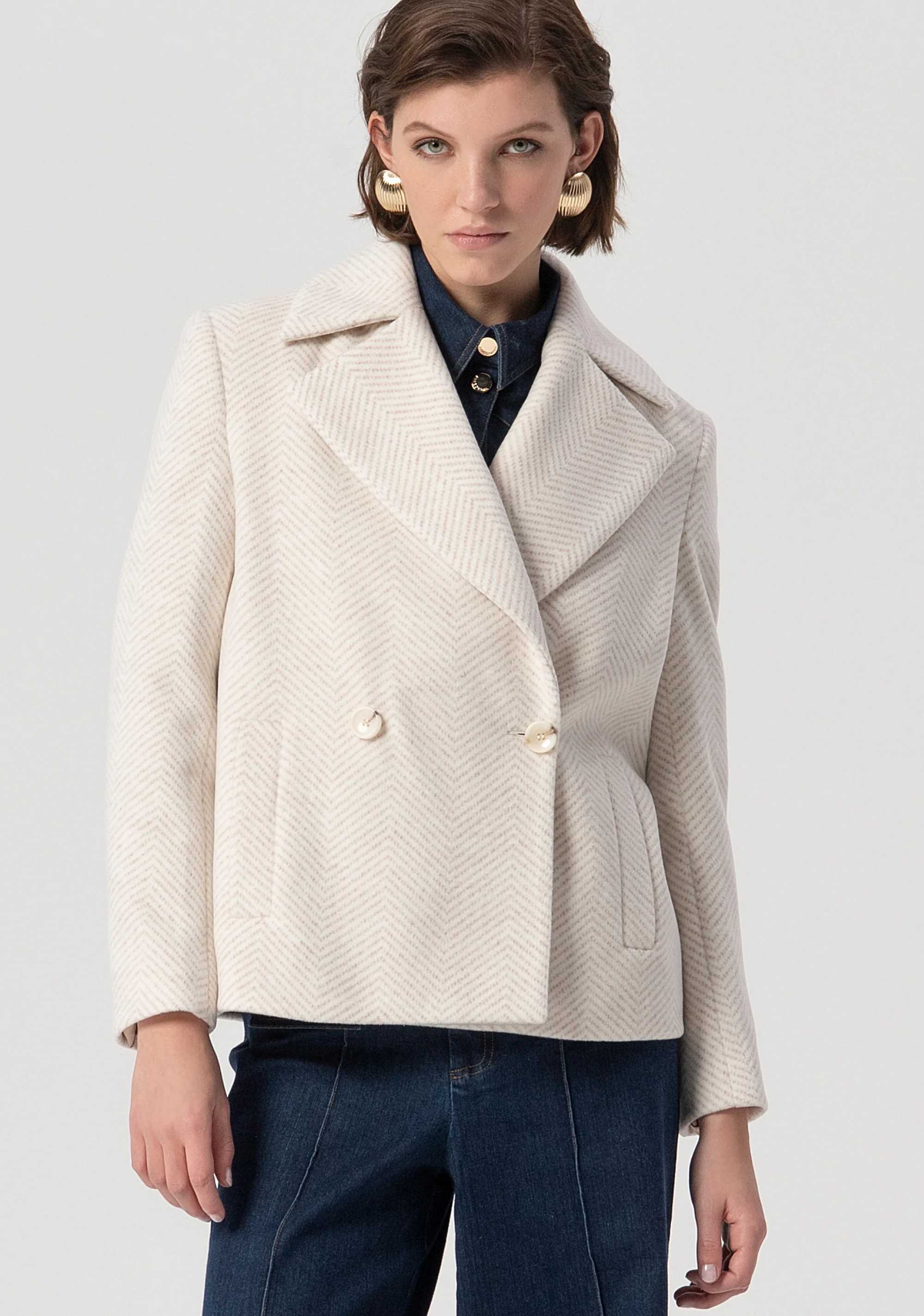 Cappotto regular caban doppiopetto in tessuto spigato, revers classico, bottoni per apertura, tasche laterali, e con maniche lunghe.