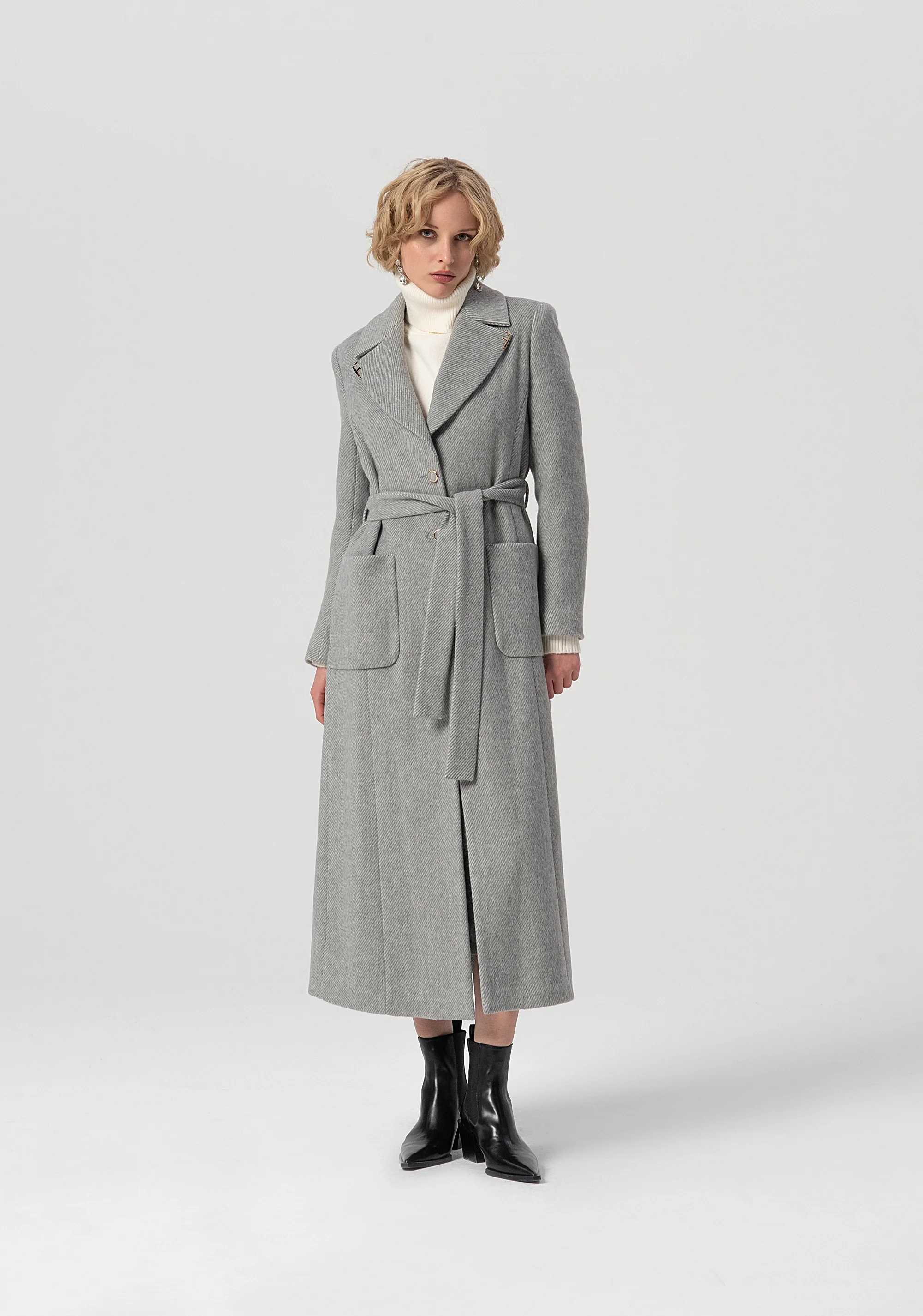 Cappotto regular lungo monopetto in tessuto spigato con lana, revers classico con logo, bottoni per apertura, fusciacca in vita, tasche a toppa, spacco sul retro, e con maniche lunghe.
