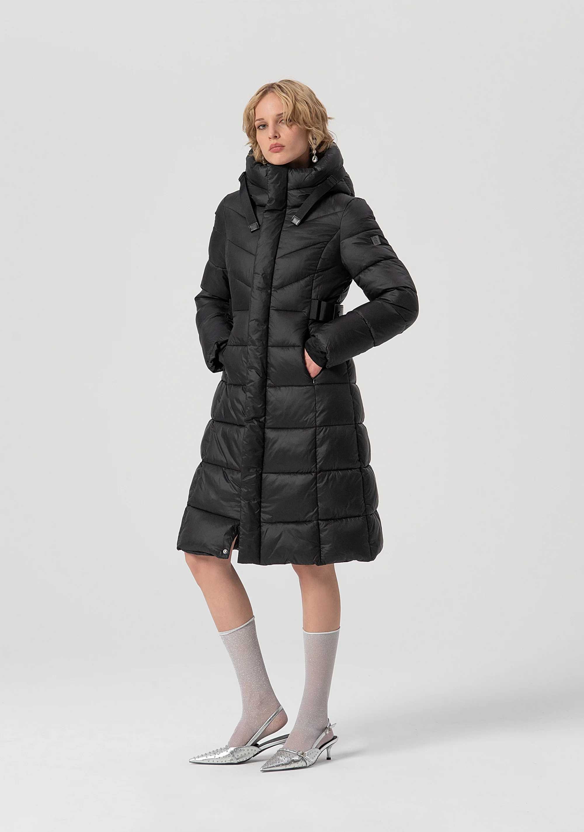 Piumino regular lungo in nylon trapuntato, apertura centrale, cappuccio con coulisse, tasche laterali, e con maniche lunghe.