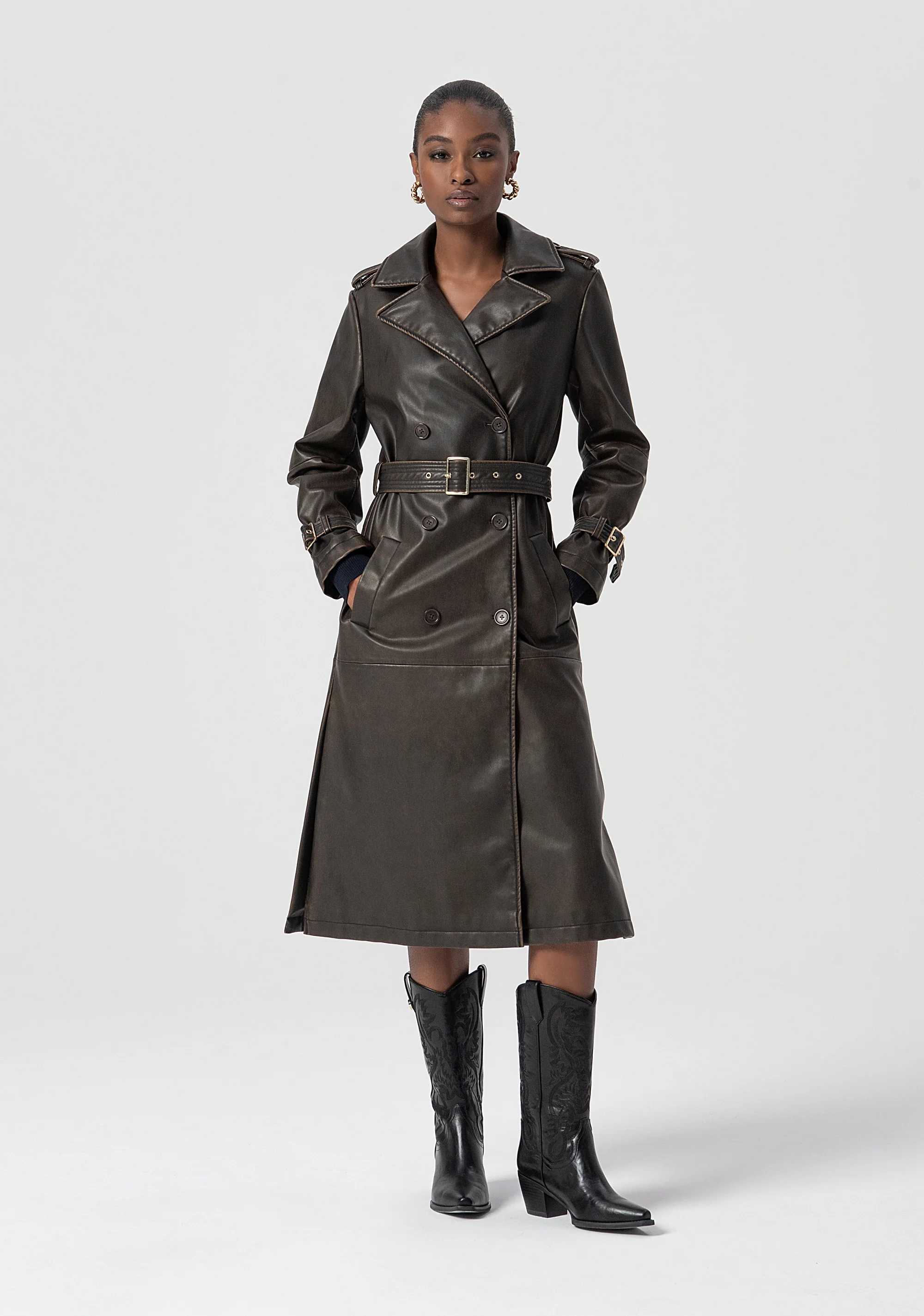 Trench regular lungo con cintura, in finta pelle, revers classico, doppiopetto, tasche laterali, spacchi sui lati, e con maniche lunghe.