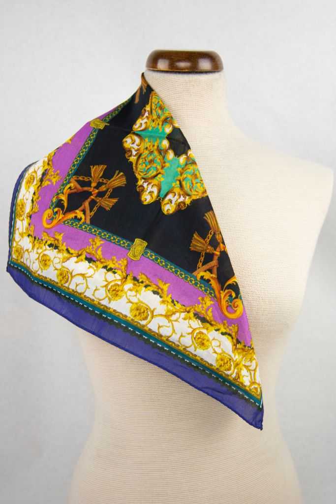 Foulard piccolo misura 45 x 45 cm. Composizione 30% seta 70% cotone. Motivo a rosone centrale con classico motivo a foglie motivo baroccheggiante a cui si aggiungono catene e nappine sempre color oro. Foulard fantasia realizzato in Italia, colore di fondo nero con motivo barocco color oro su tinte unite color verde, fucsia e bluette.