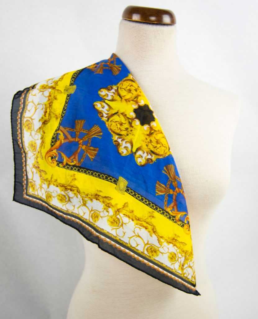 Foulard piccolo misura 45 x 45 cm. Composizione 30% seta 70% cotone. Motivo a rosone centrale con classico motivo a foglie motivo baroccheggiante a cui si aggiungono catene e nappine sempre color oro. Foulard fantasia realizzato in Italia, colore di fondo nero con motivo barocco color oro su tinte unite color giallo e bluette.